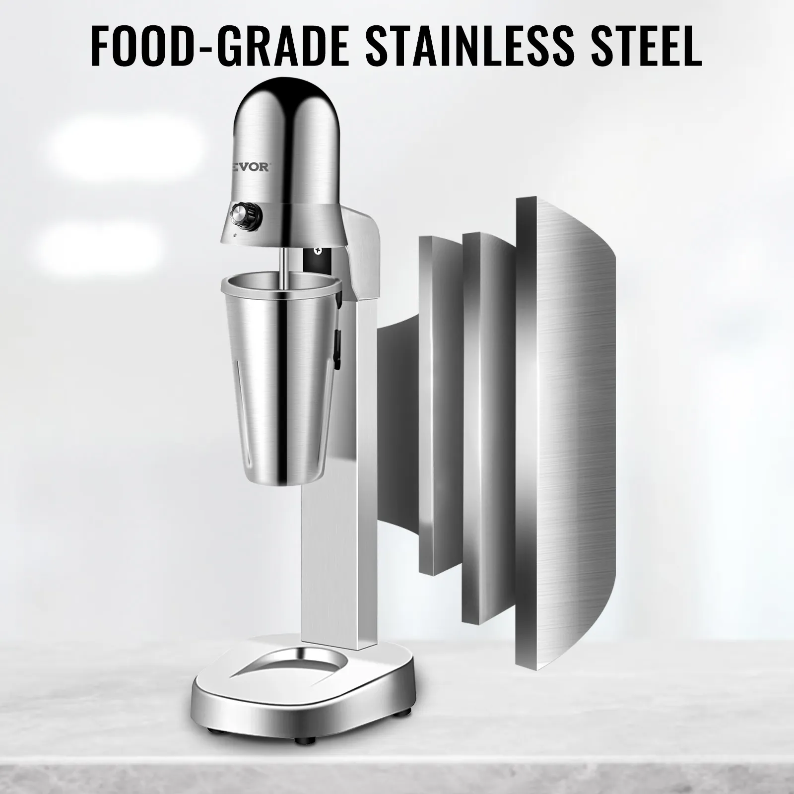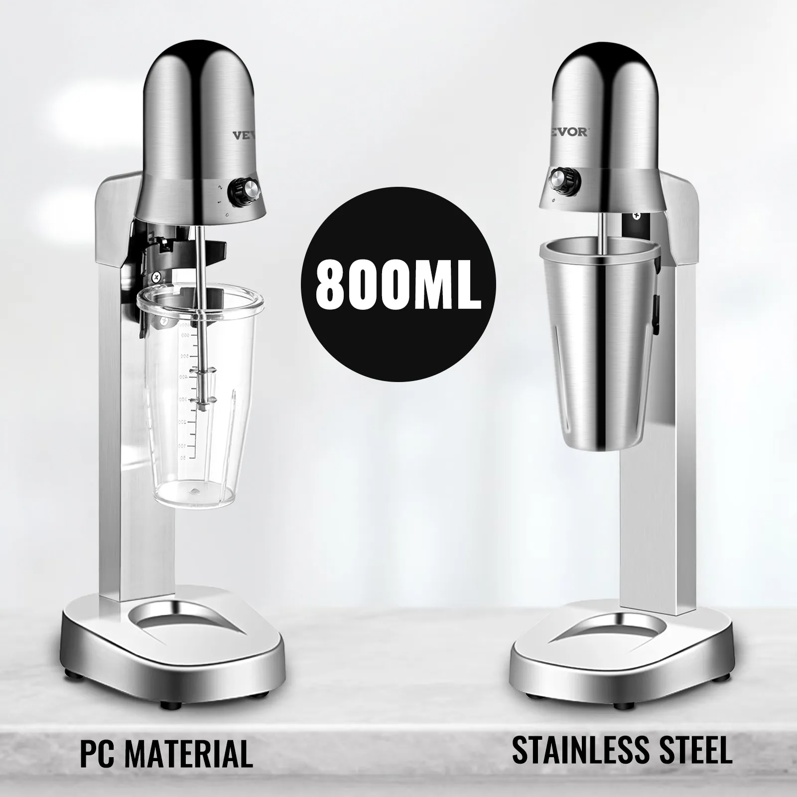 The electric milkshake maker comes with 2 mixing cups featuring a large volume of 800 ml. One is made of stainless steel with a brushed surface, and the other is built with transparent PC material.