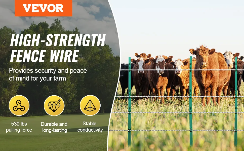 High Tensile Strength: This electric fence wire has a diameter of 1/4" and comes in a roll length of 656ft/200m, capable of withstanding up to 530 lbs of tension. This high-tensile design ensures stability and safety, making it ideal for temporary pastures and rotational grazing.