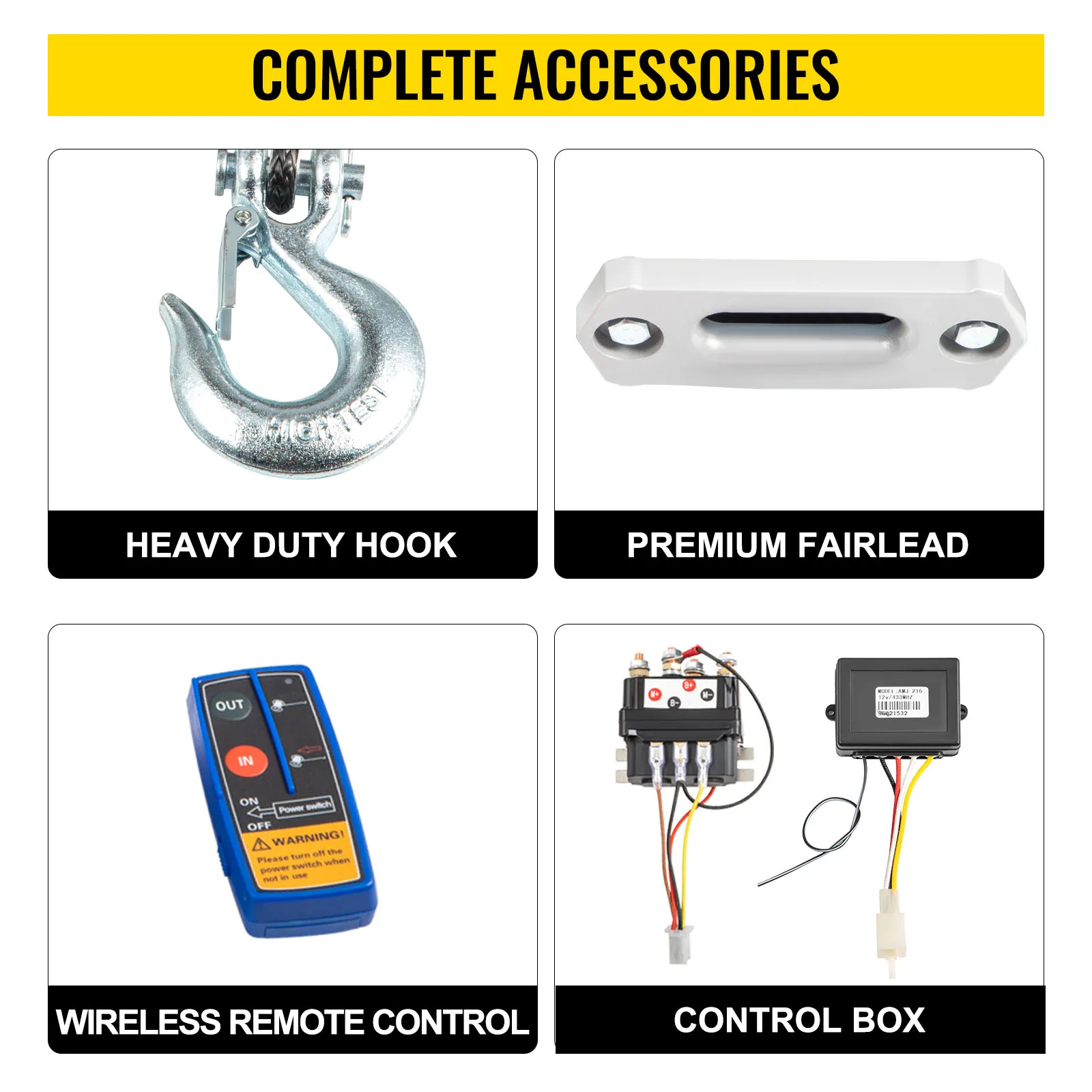 All winches come with a thoughtful accessory kit, including a wireless remote tool, a hook, control box, and a roller fairlead, ensuring excellent working performance.