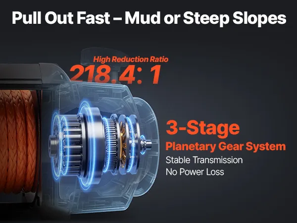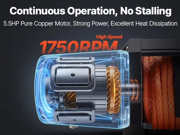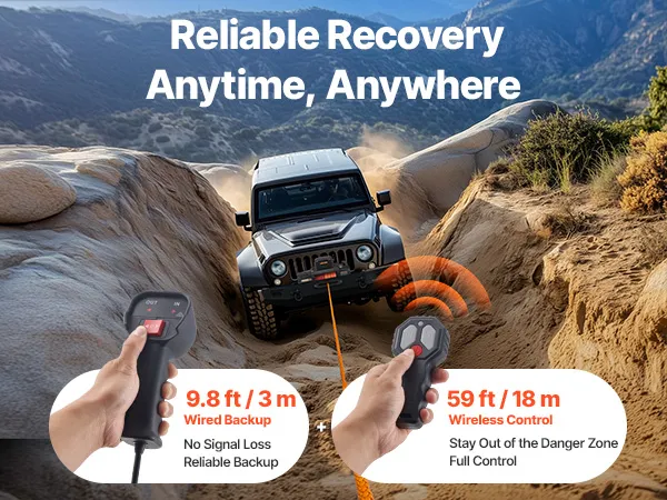 High-Power Rescue: The 5.5HP motor of the jeep winch with a 218.4:1 3-stage planetary gear gives steady pulling power. A 59 ft wireless remote ensures secure control, while a 9.8 ft wired remote adds backup support