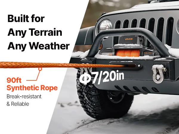 Durable Synthetic Rope: The 7/20 in x 90 ft rope of the truck winch is made of 12-strand polyethylene, built to handle UV and wear. Even with strand friction, the rope stays strong, ideal for towing vehicles on steep terrain