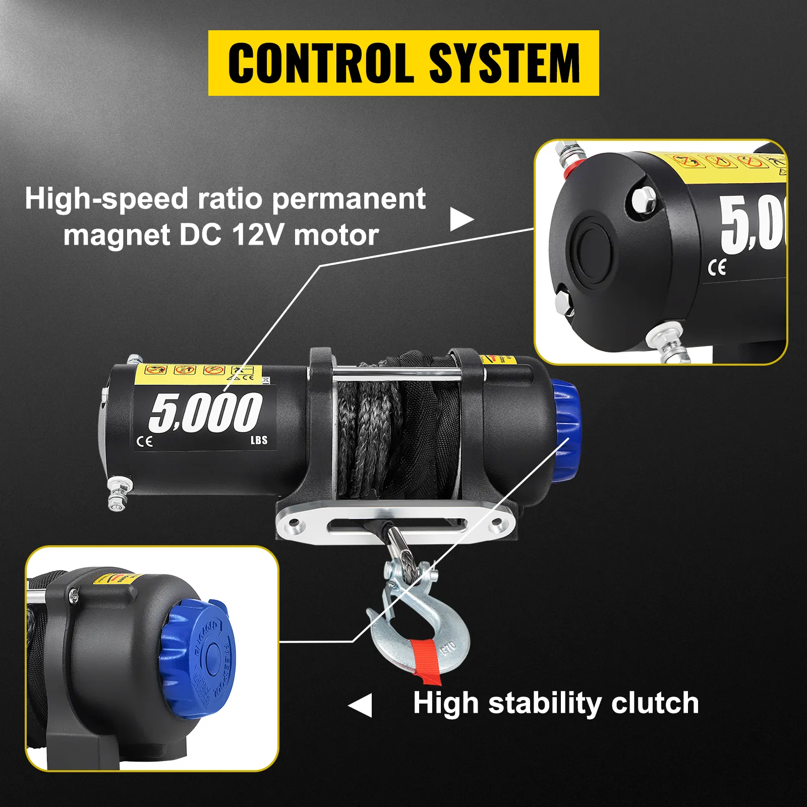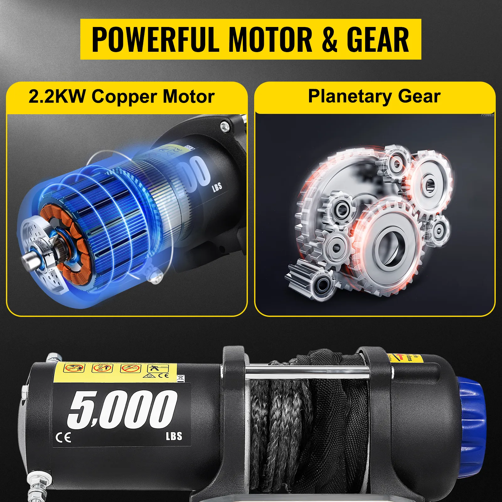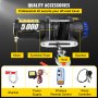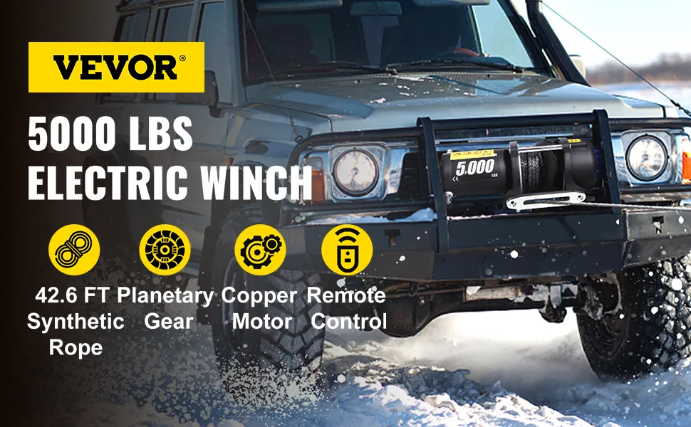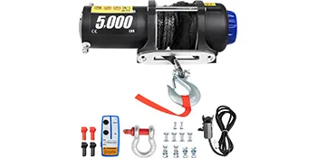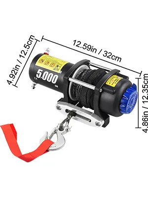 The electric winch features a 5000 lbs loading capacity, suitable for an ATV, UTV, car, boat, truck, jeep, modified vehicle, and utility trailer.