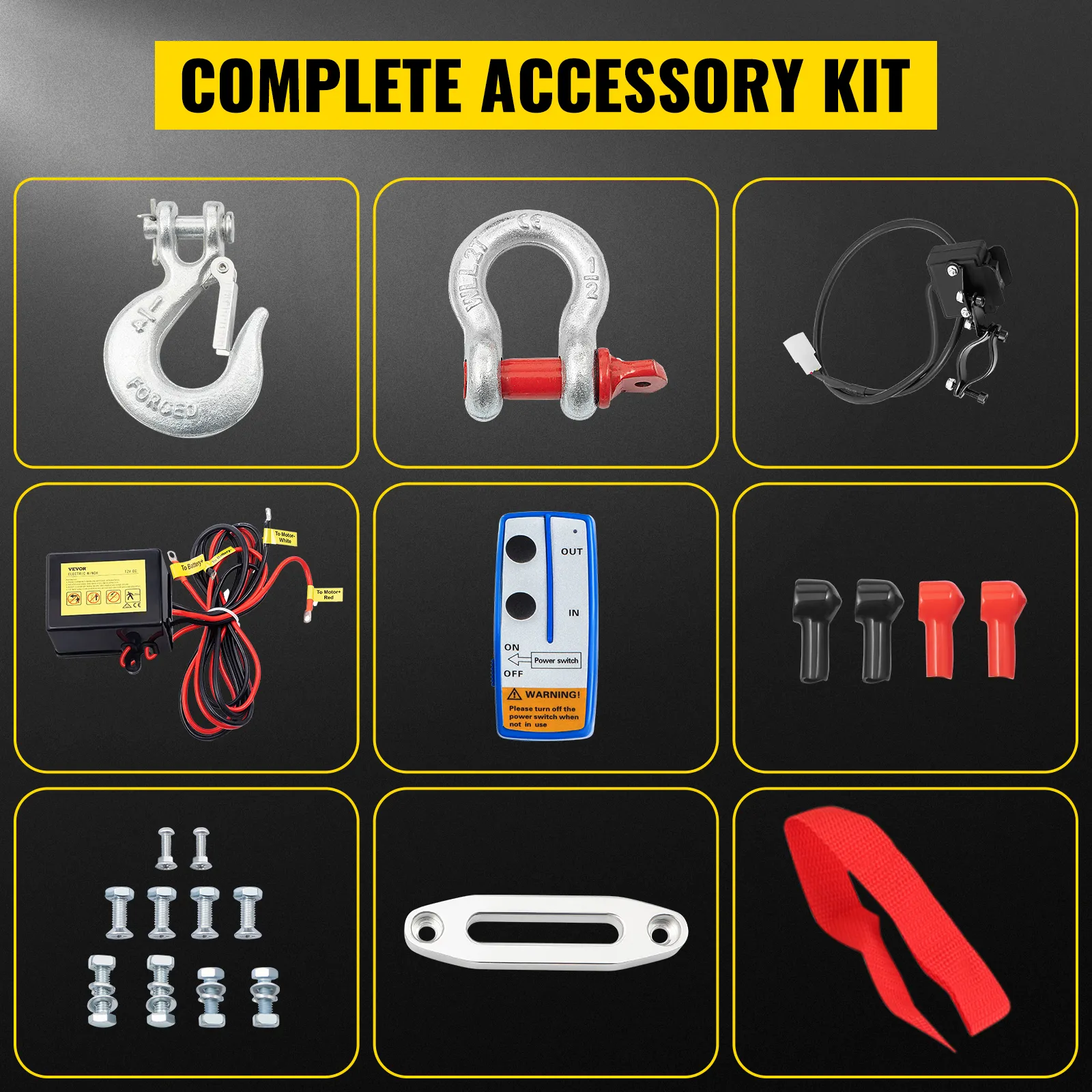 All towing winches come with a fully equipped accessory kit, including remotes, a hook, a shackle, control box, wire, and much more, ensuring excellent working performance.
