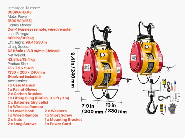 VEVOR 2-in-1 Electric Hoist Winch, 300 kg Capacity, 1500W Portable Power Winch Crane, 30 m Lifting Height, 18.9 m/min with Wired and Wireless Remote Control for Factory, Warehouss, Garage