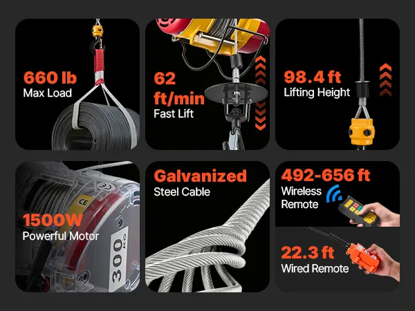 Powerful Lifting Capacity: This portable power winch handles up to 660 lb, lifts at 98.4 ft/min (no load), and reaches 62 ft. It helps you hoist engines, steel, or furniture in garages, warehouses, or balconies
