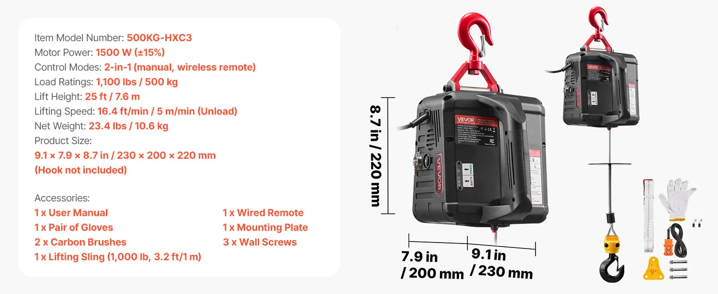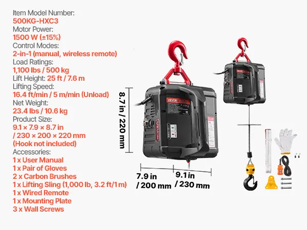VEVOR 2-in-1 Electric Hoist Winch, 500 kg Capacity, 1500W Portable Power Winch Crane, 7.6 m Lifting Height, 5 m/min with Manual and Wired Remote Control for Factory, Warehouss, Garage