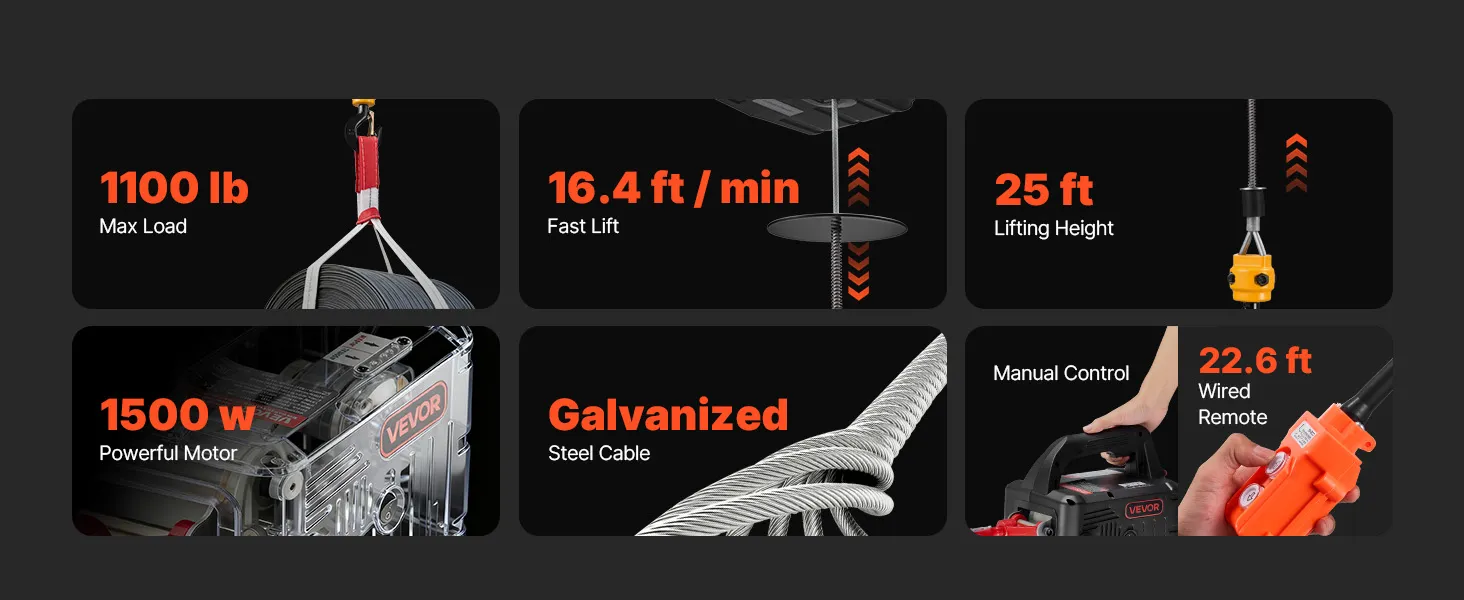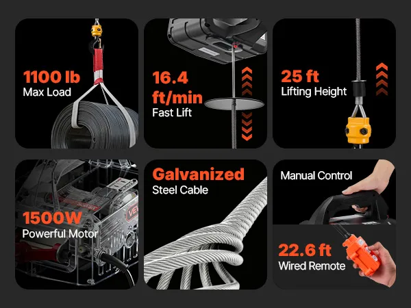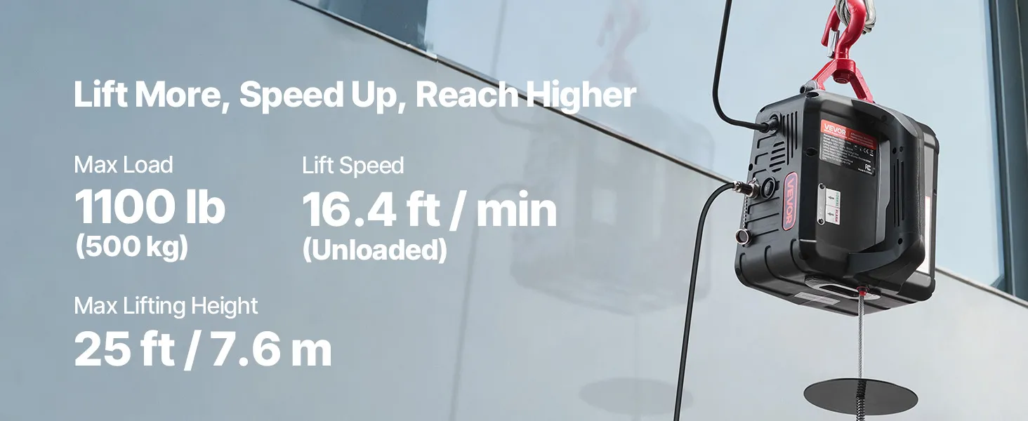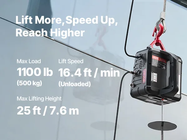 Powerful Lifting Capacity: This portable power winch handles up to 1,100 lb, lifts at 16.4 ft/min (no load), and reaches 25 ft. It helps you hoist engines, steel, or furniture in garages, warehouses, or balconies