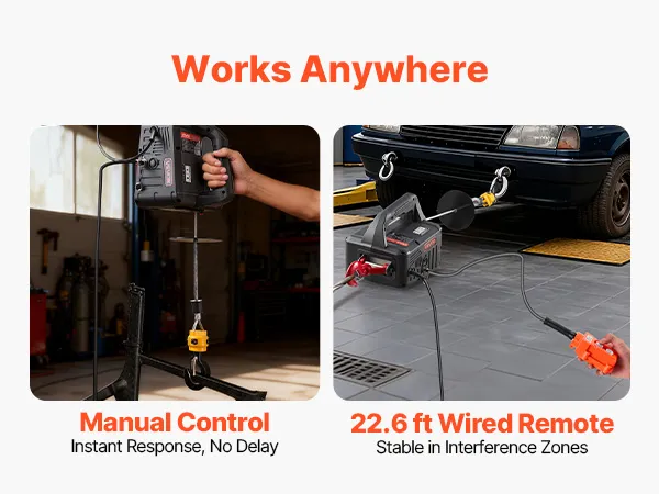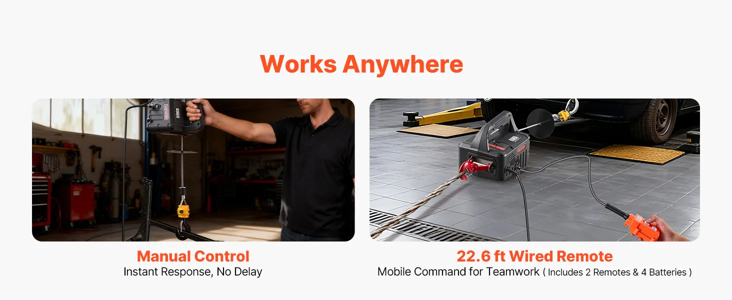 2-in-1 Easy Control: This power electric hoist manages vertical lifting and horizontal pulling. The handle buttons respond fast, and the 22.6 ft wired remote delivers precise close control