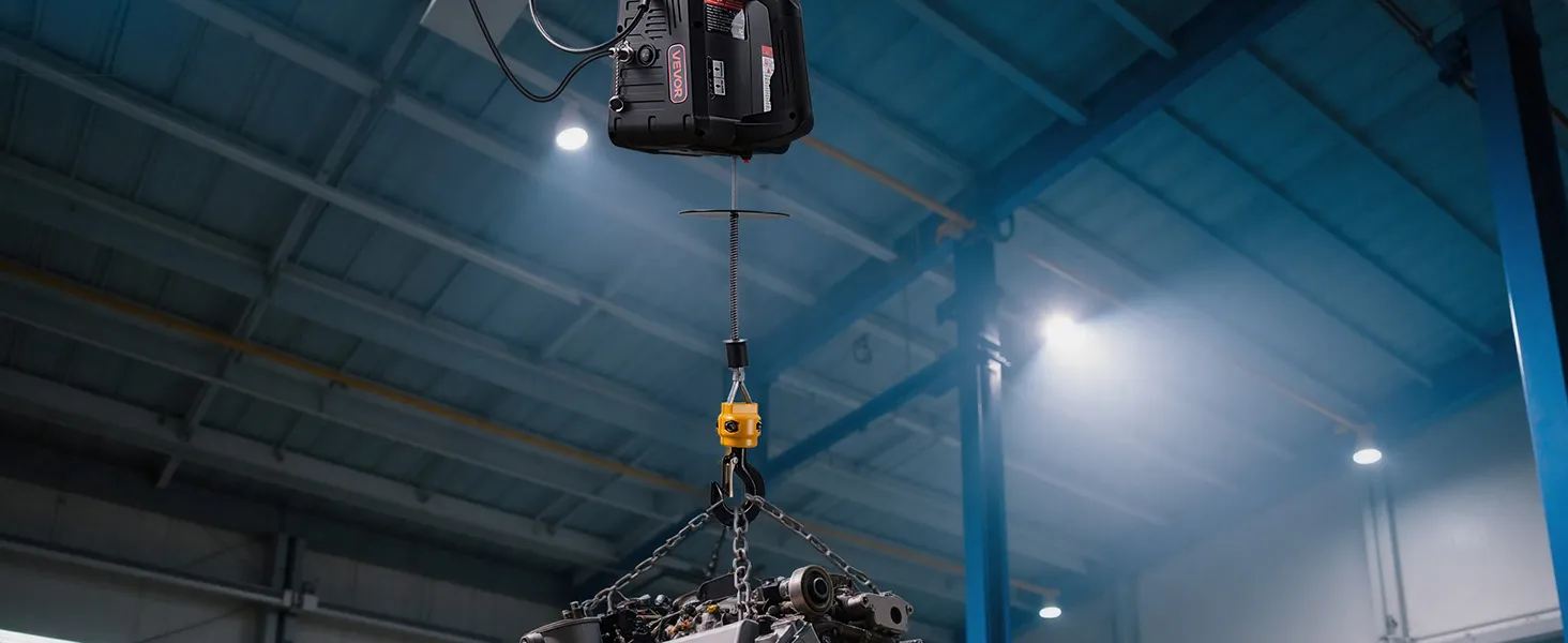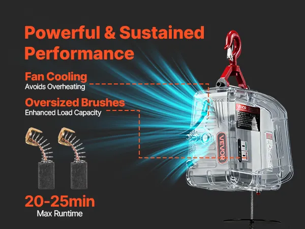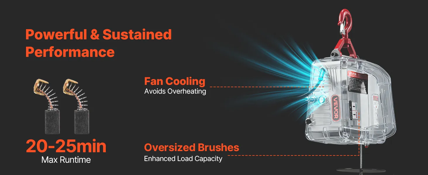 Durable, Reliable Motor: This electric winch crane uses a 1500 W motor with forced-fan cooling and enlarged carbon brushes. The design helps deliver steady output and longer working time for everyday tasks