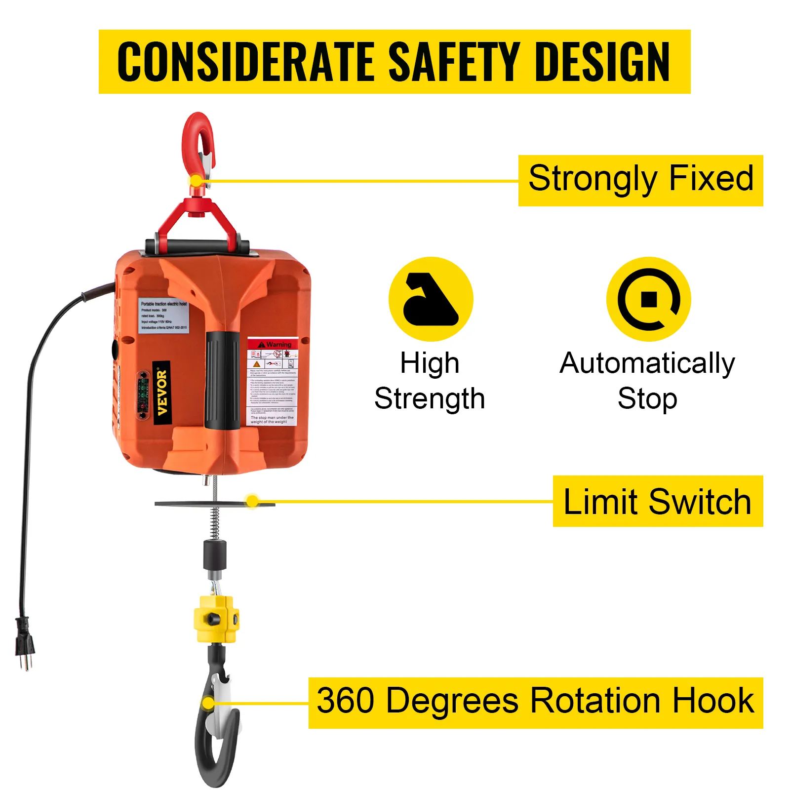 Upper and lower swivel hooks prevent falling, and the limit switch design will preserve the hoist winch by automatically stopping.