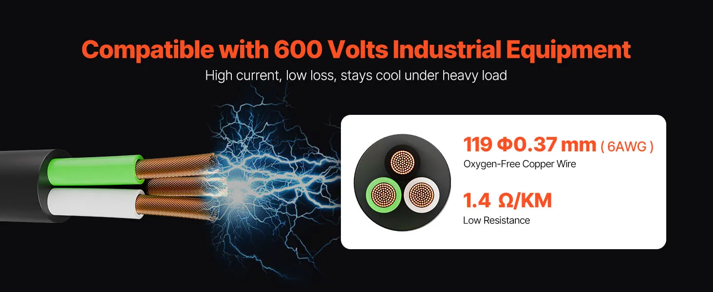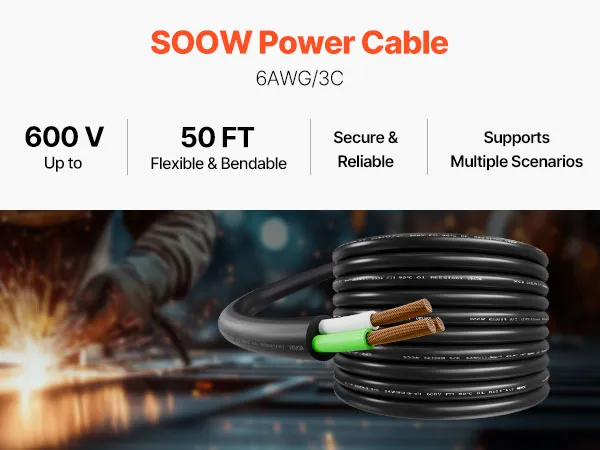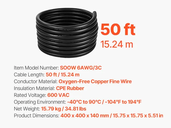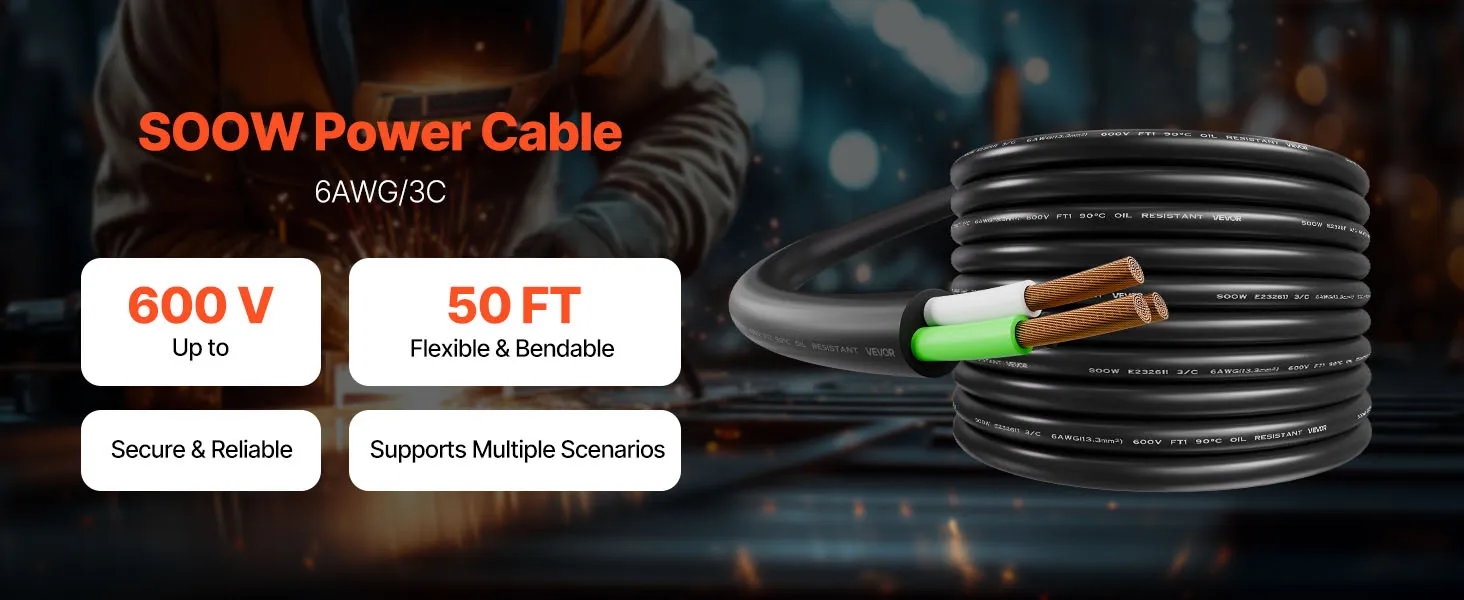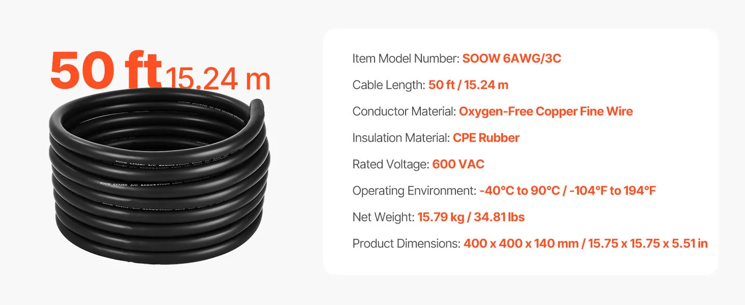 VEVOR 15.24 m 6AWG Portable Power Cable (3 Conductor), Heavy Duty 600V SOOW Electrical Power Cable, Industrial Electric Wire, Premium CPE Rubber Jacket, Copper Extension Cord for Welder Machine