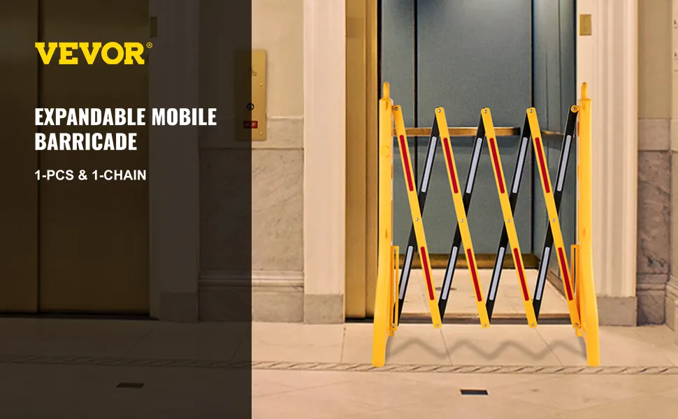 The expandable barricade gate is constructed of high-quality PE, durable to withstand frequent use and bad using conditions. Black and yellow powder-coated finish is visible and unfaded.