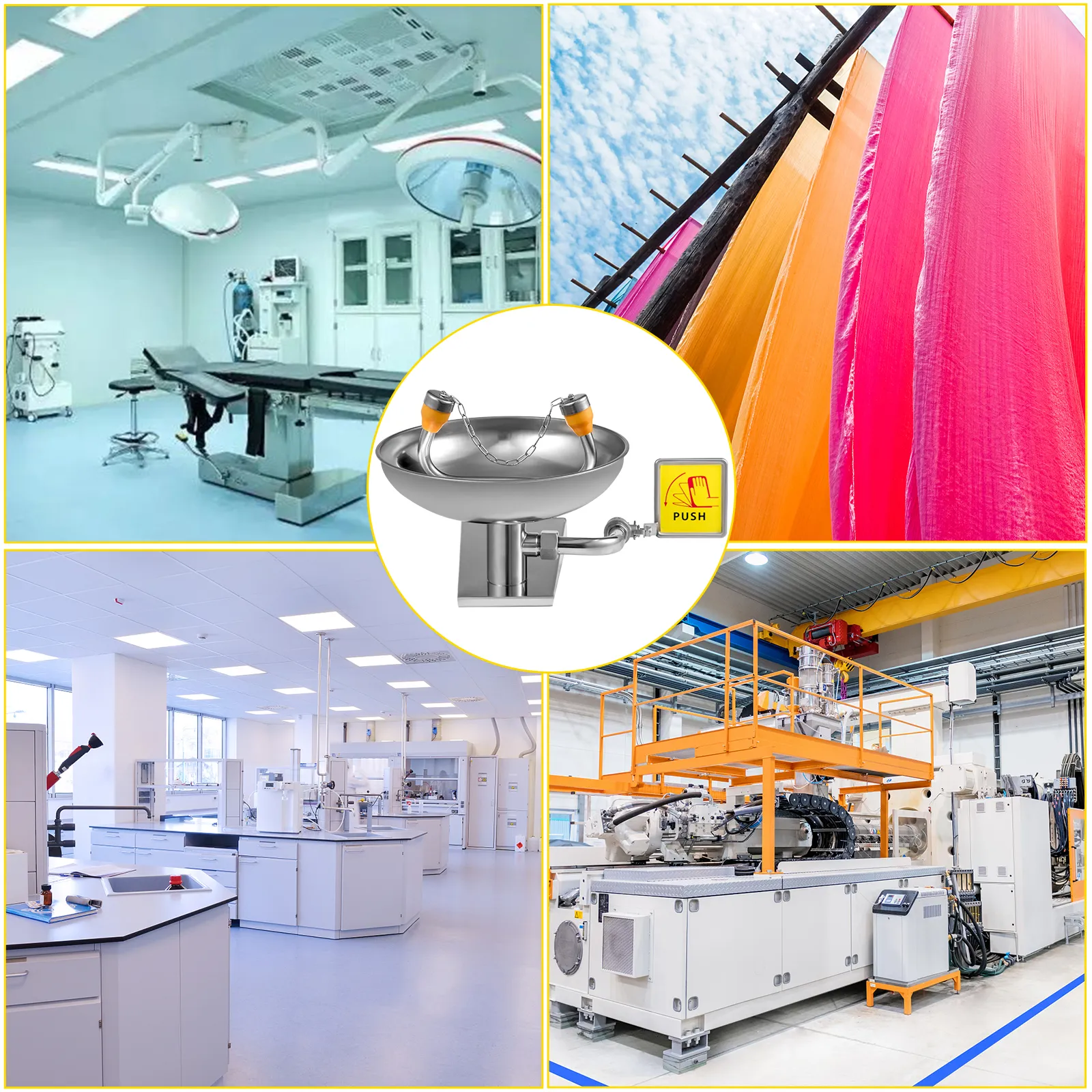 The wall-mount eyewash station can be used in petroleum, chemical, manufacturing, casting, pharmaceutical, medical, and other industries to give emergency cleaning to eyes.