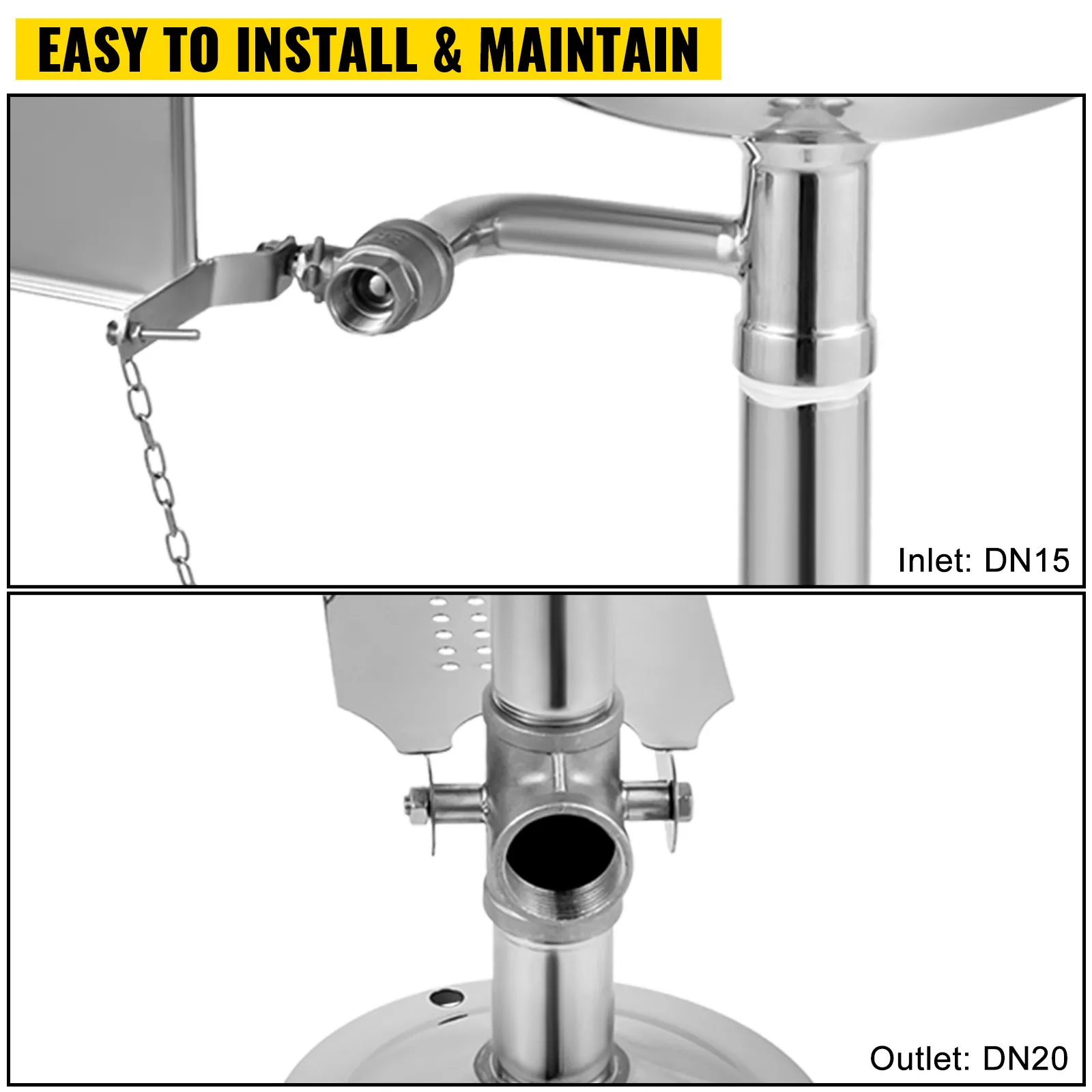 The eyewash station can be easily installed on the ground with three pre-drilled holes and three screws. Assembly and installation are easy. Inlet interface dimensions: DN15; Outlet interface dimension: DN20.