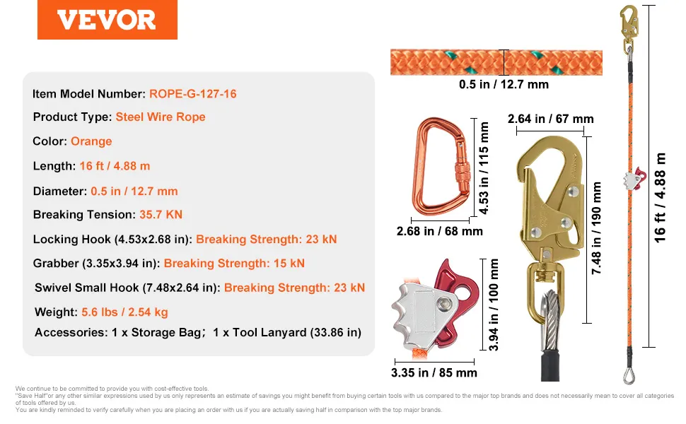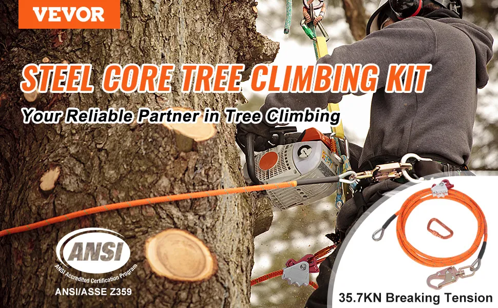 Climb with Confidence: Secure your tree climbing work at heights with the VEVOR 16ft steel-core flipline. This steel rope boasts a durable 0.5'' diameter and a robust 30 kn breaking strength, compliance with ANSI standards, ensuring your fall protection. A must-have tool for tree climbers.
