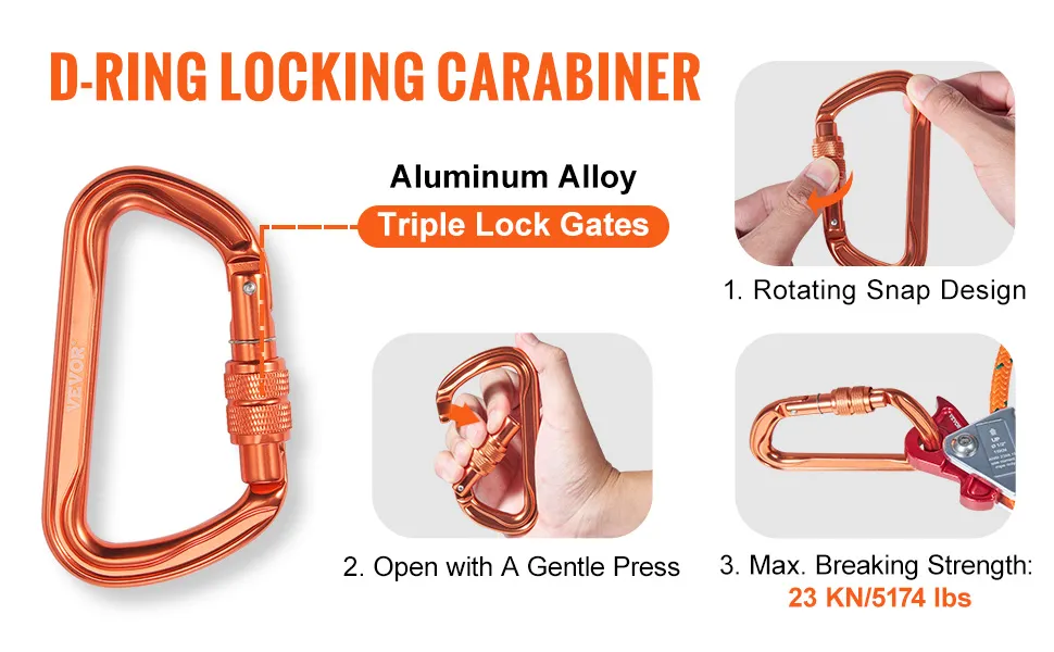 Our carabiner provides stability and support during tree climbing with its impressive breaking strength of 23 KN/5174 lbs. It features a 3-Way locking mechanism for instant locking and easy one-handed opening.
