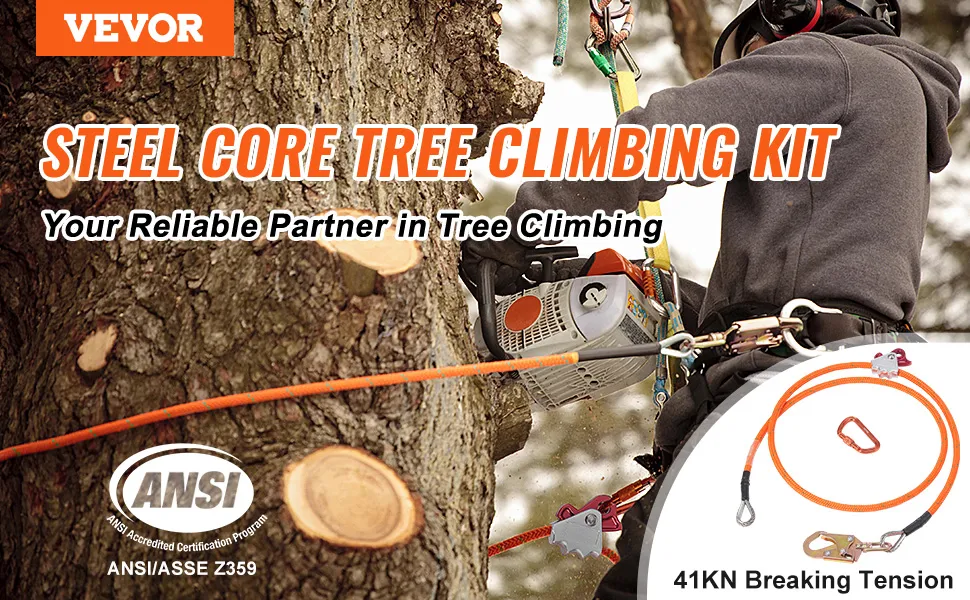 Climb with Confidence: Secure your tree climbing work at heights with the VEVOR 8ft steel-core flipline. This steel rope boasts a durable 0.6'' diameter and a robust 30 kn breaking strength, compliance with ANSI standards, ensuring your fall protection. A must-have tool for tree climbers.