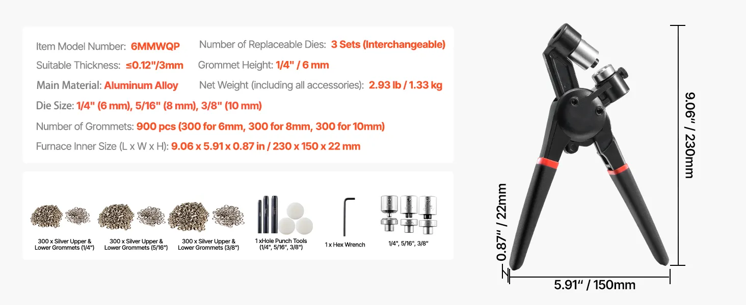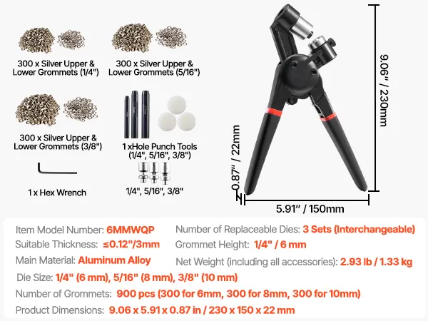 Practical Set: Available in 1/4", 5/16", 3/8" , each size comes with 300 silver grommets and a hole punch. This grommet tool kit includes a wrench and manual for quick swaps and versatile DIY tasks