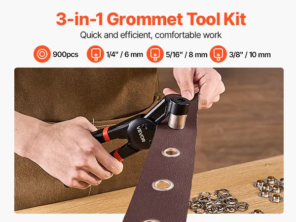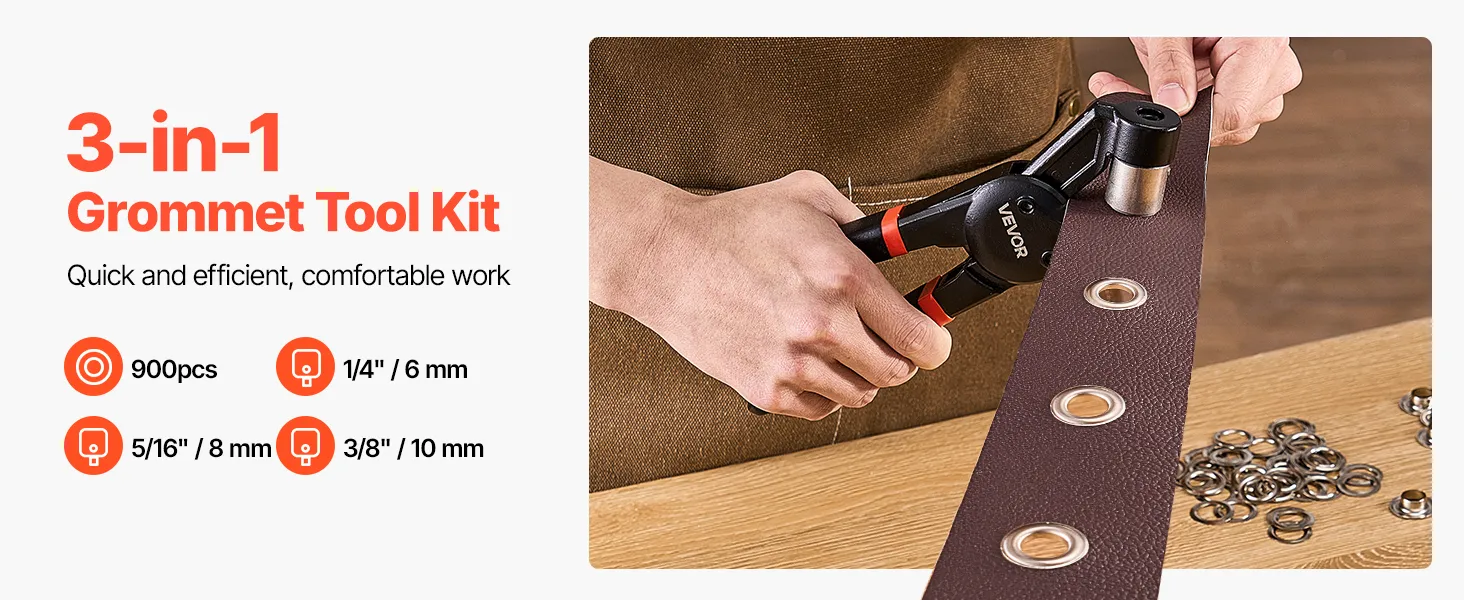 VEVOR Grommet Tool Kit, 900 PCS 6 mm 8 mm 10 mm Multi Size Metal Eyelets Grommets, Eyelet Kit with Manual Grommet Press Pliers, Hole Punch, and Block, for Leather Tarp Shoes Crafts Fabric Belt
