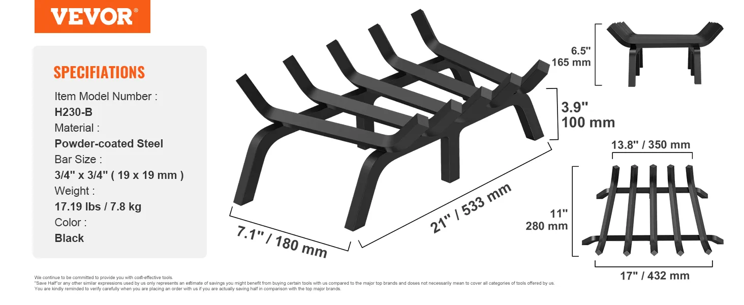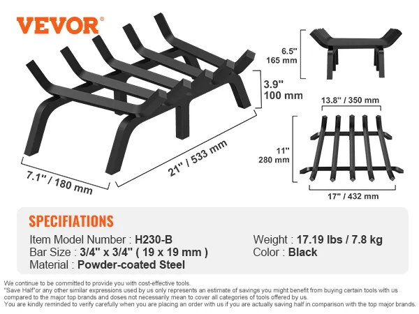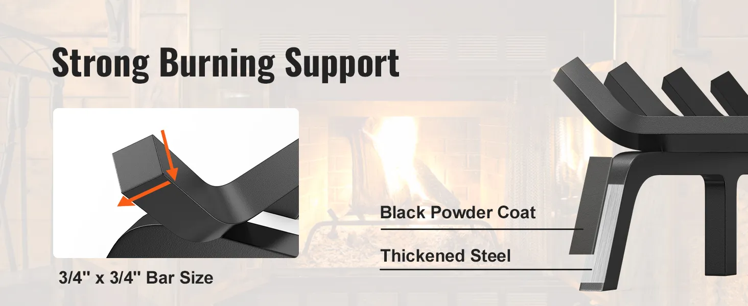 The VEVOR fireplace log grate is made from 3/4 inch solid steel. This construction ensures the grate's durability and heat resistance. The steel bars are powder-coated, adding to their longevity. This strong build means the grate can handle intense fires without warping. Its black color fits seamlessly into any fireplace setting. Heavy-duty fireplace grate construction also means fewer frequent replacements, saving you money and effort in the long run. The 17.19-pound weight adds stability, ensuring the grate stays in place during use. Solid construction makes this fireplace log grate a reliable choice for any type of fireplace.