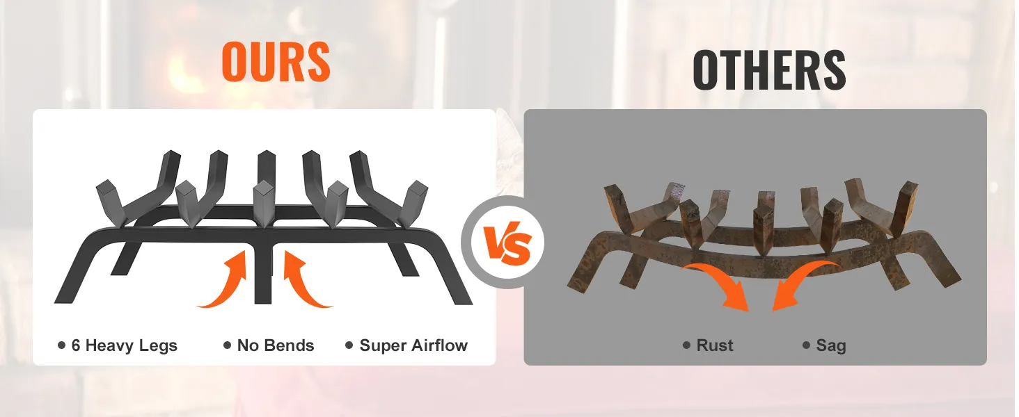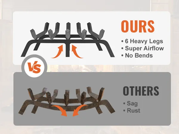 6 Support Legs: This fireplace grate is equipped with 6 supporting legs, evenly distributed across the bottom of the grate, capable of maintaining stability during long-lasting fires without sagging or warping. The sturdy support structure allows you to confidently place a large amount of firewood and maintain the fire.