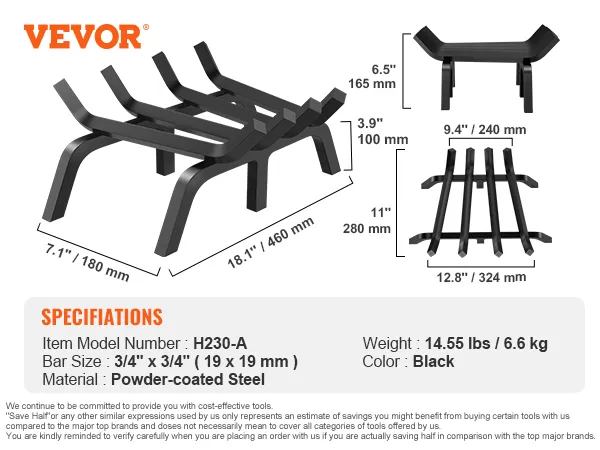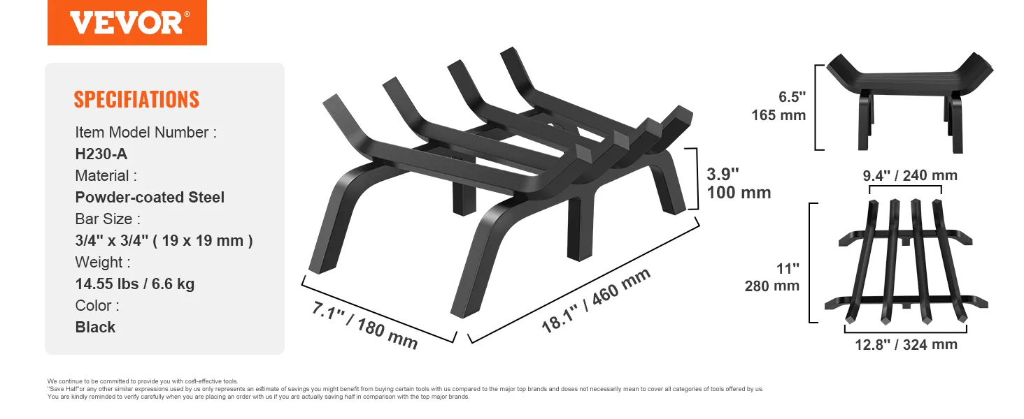 The VEVOR Fireplace Log Grate by VEVOR stands out because of its solid steel construction. It's made from 3/4 inch square bar steel. This heavy-duty fireplace grate is highly durable. It is resistant to both heat and corrosion, which ensures long-lasting use. The sleek design and precise dimensions make it perfect for any fireplace. Measuring around 18'' in length and 11'' in width, it is both compact and sturdy. So, it’s ideal for both indoor fireplace grate and outdoor fireplace grate. The durability of the grate makes it great even after multiple uses. You can count on it for many years to come.