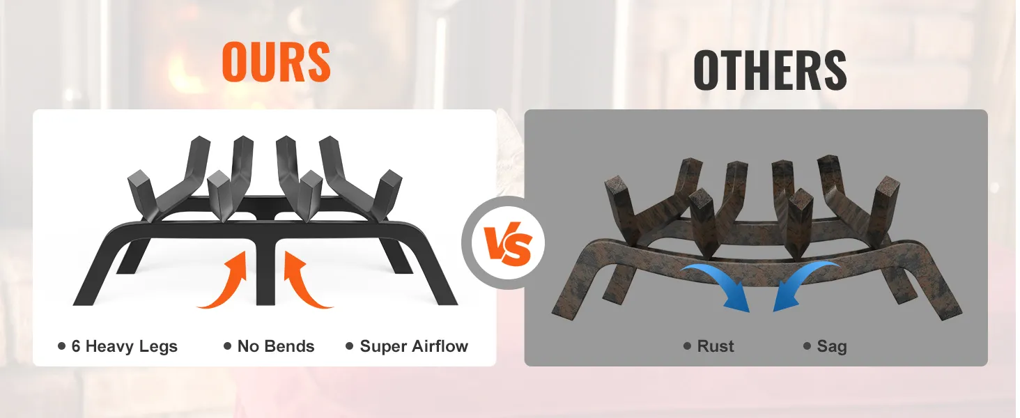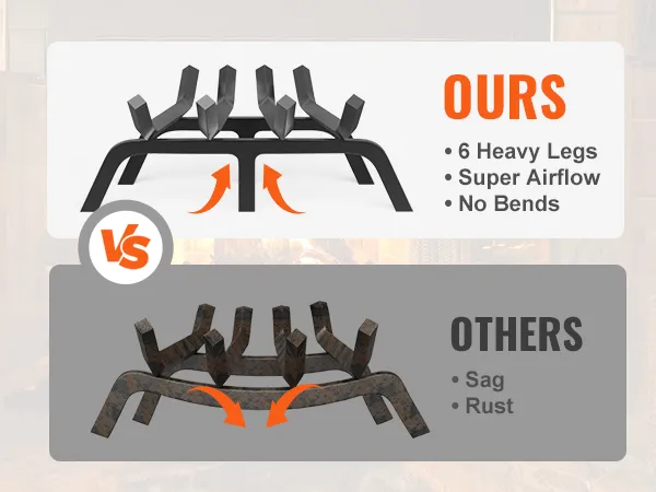 VEVOR Fireplace Log Grate lifts firewood 3.9 inches off the ground. This allows air to circulate around and underneath your burning area. Increased airflow ensures more efficient burning. It also helps distribute heat evenly across all rooms, making it highly effective in providing warmth. Additionally, this feature enhances the overall burning experience. The improved air circulation makes maintaining a consistent fire easier. Both comfort and efficiency are crucial factors.