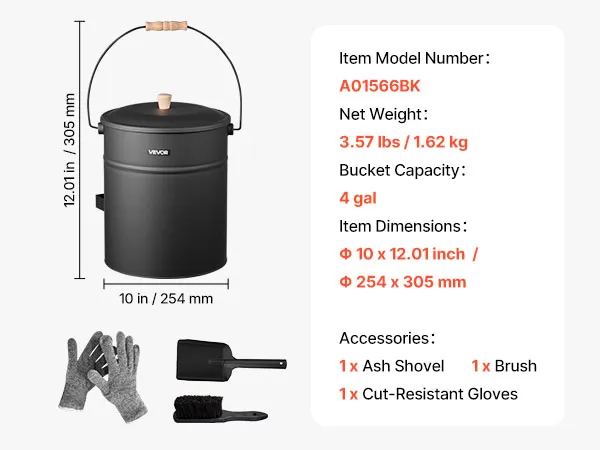 Large Capacity: This ash bucket with lid has a large capacity of 4 GAL. With a wide opening design of 10 x 10 in (254 x 254 mm), it not only enables quick filling of sufficient fuel and ash, but also avoids spilling during pouring