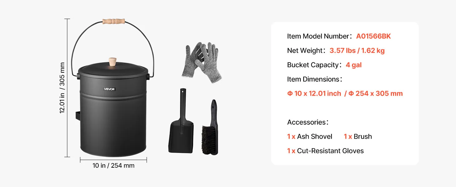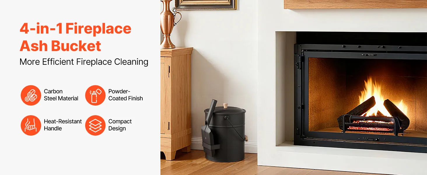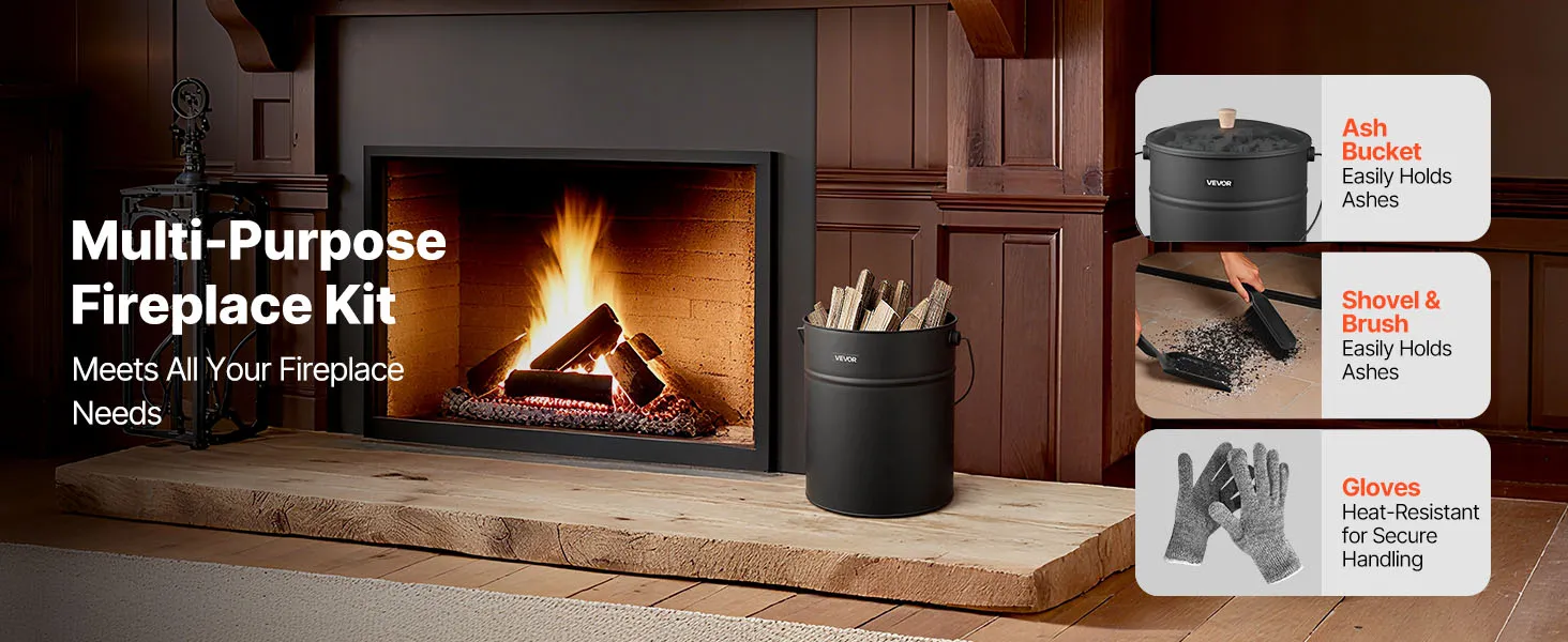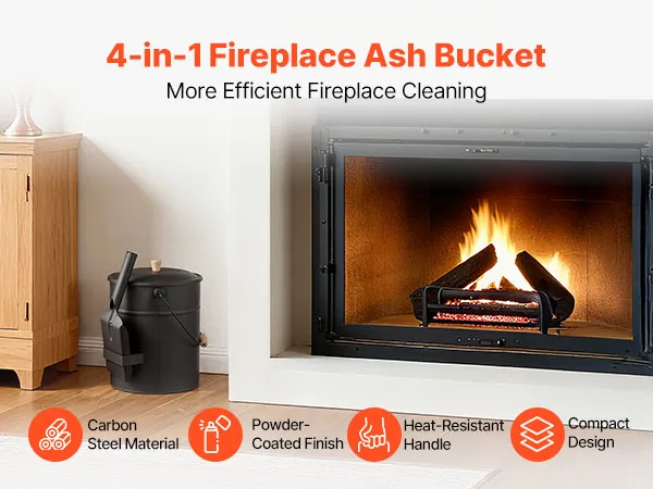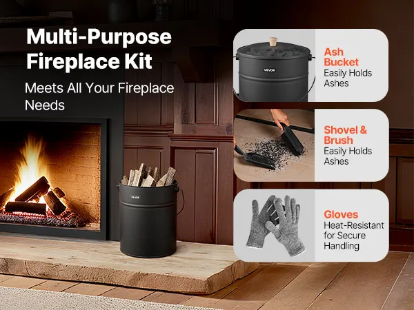 4-in-1 Fireplace Ash Bucket: This ash bucket includes a lidded ash bucket, ash shovel, brush, and gloves. It easily handles stove ash cleaning and fuel adding. All parts work together, making fireplace cleaning more efficient and convenient