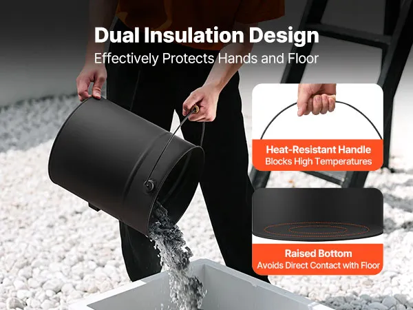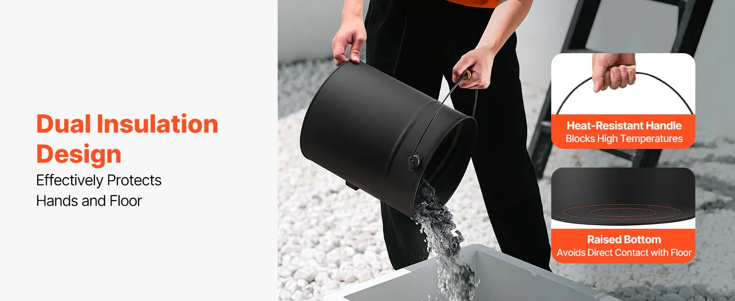 The ash bucket with lid adopts a double heat insulation design. Built with a heat-resistant handle to block high heat for hand protection. The raised bottom keeps the bucket off the floor, avoiding heat damage to the floor. This dual protection ensures secure and convenient use for you.