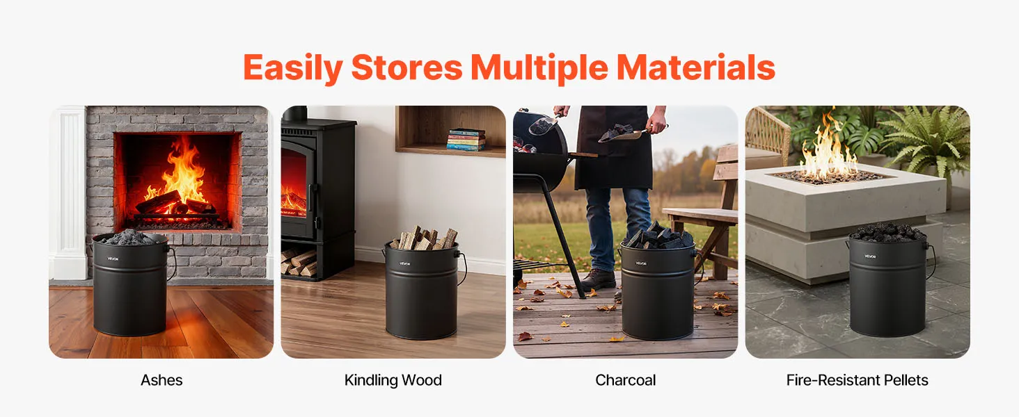 This sturdy and long-lasting ash bucket with lid and shovel serves as an excellent storage container. It can easily hold various materials such as ash, charcoal, kindling wood, and fire-retardant pellets, realizing multi-purpose use in one bucket.