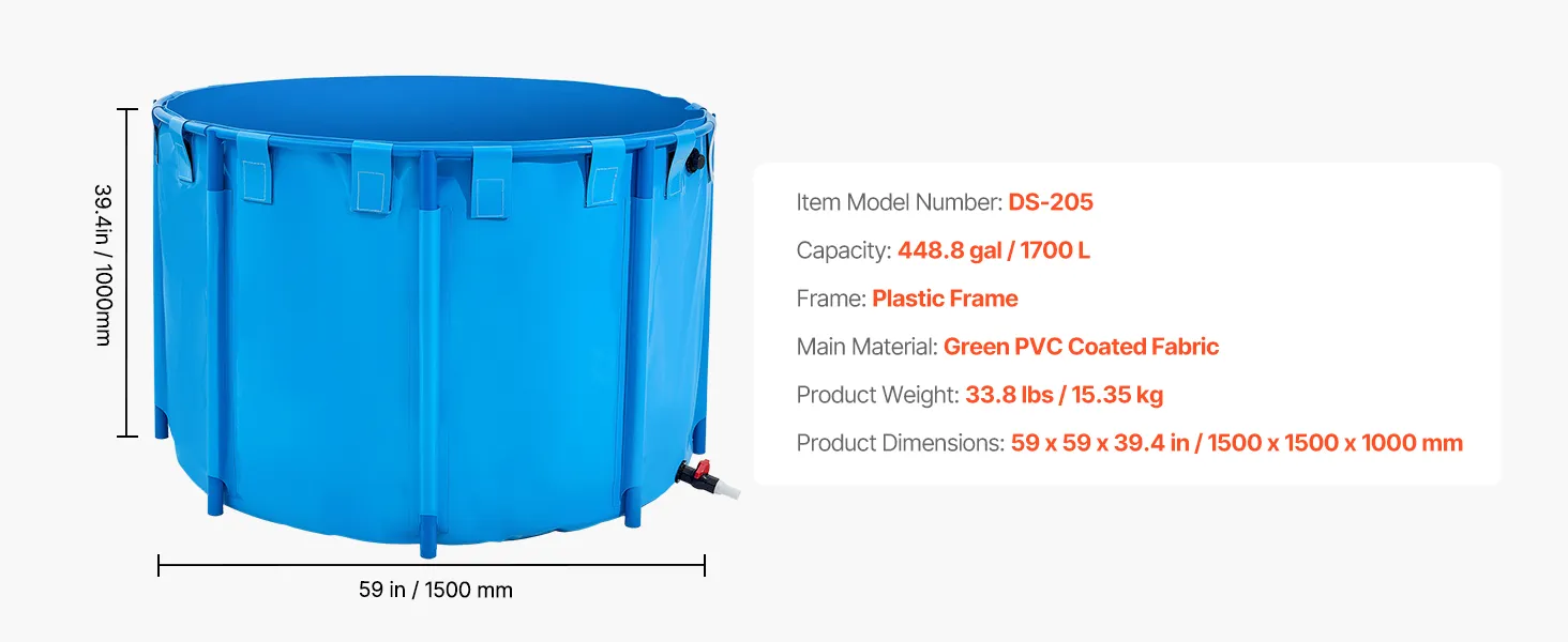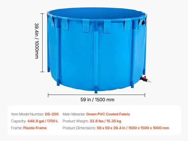 Large Capacity: This PVC fish pond measures 59 x 59 x 39.4 in (1500 x 1500 x 1000 mm) and holds up to 448.8 gallons, providing ample space for aquatic life. It is ideal for indoor and outdoor aquaculture.