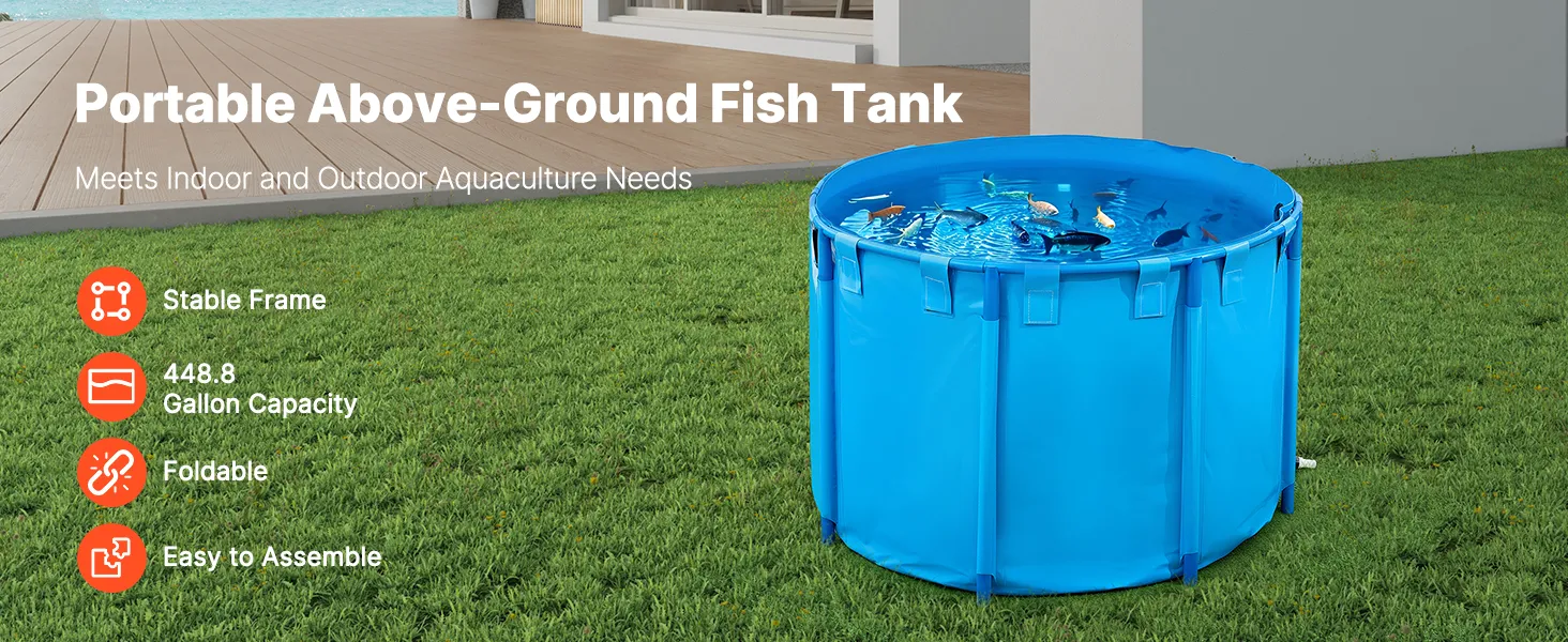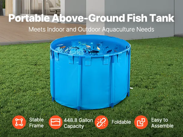 This pond, made of thickened PVC fabric, is wear-resistant with leak-proof stitching. Durable PVC pipes ensure long-lasting use. Its 448.8-gallon capacity provides ample space for aquatic life like koi, goldfish, shrimp, and crabs, ideal for indoor and outdoor use.