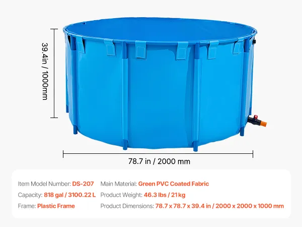 Large Capacity: This PVC fish pond measures 78.7 x 78.7 x 39.4 in (2000 x 2000 x 1000 mm) and holds up to 818 gallons, providing ample space for aquatic life. It is ideal for indoor and outdoor aquaculture.