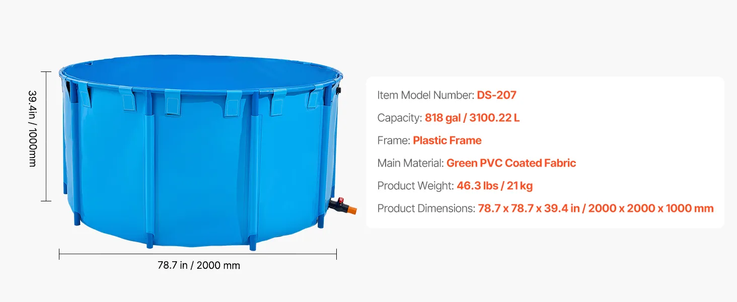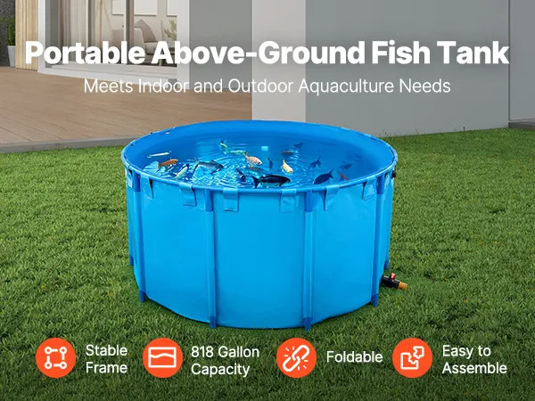 This pond, made of thickened PVC fabric, is wear-resistant with leak-proof stitching. Durable PVC pipes ensure long-lasting use. Its 818-gallon capacity provides ample space for aquatic life like koi, goldfish, shrimp, and crabs, ideal for indoor and outdoor use.