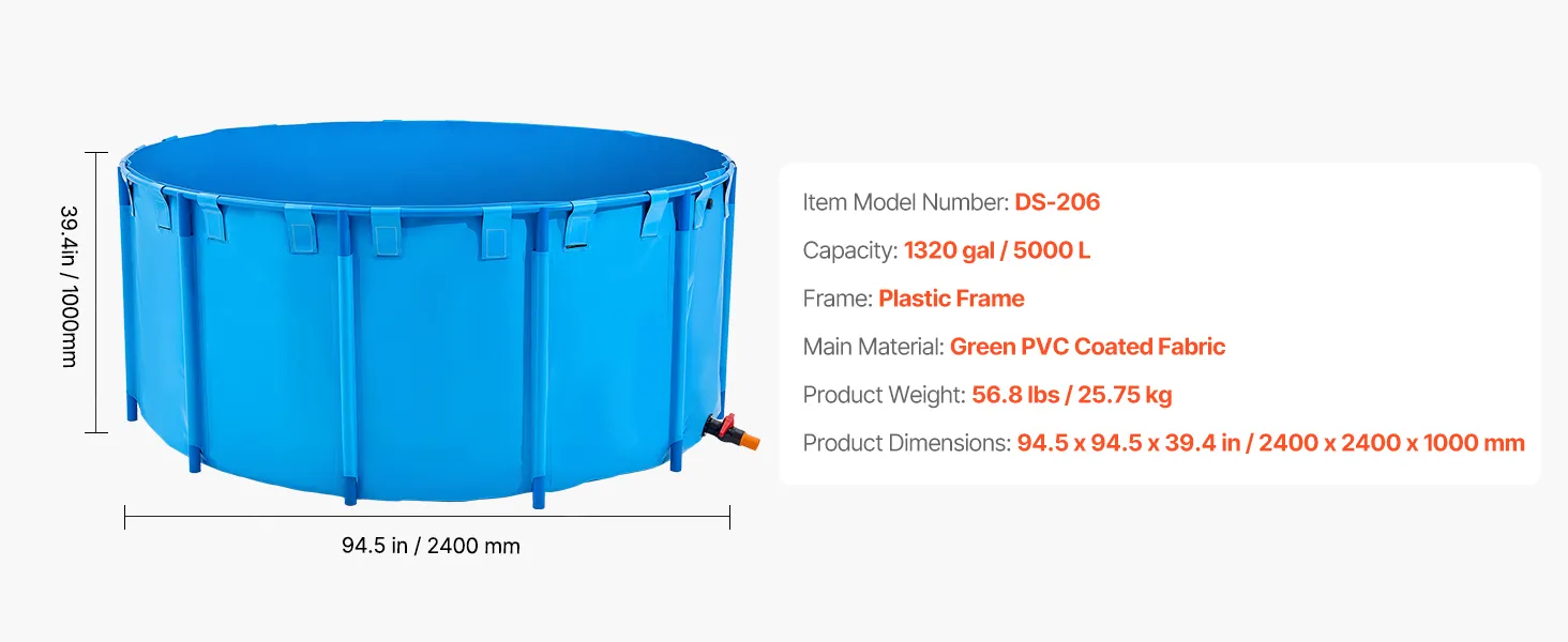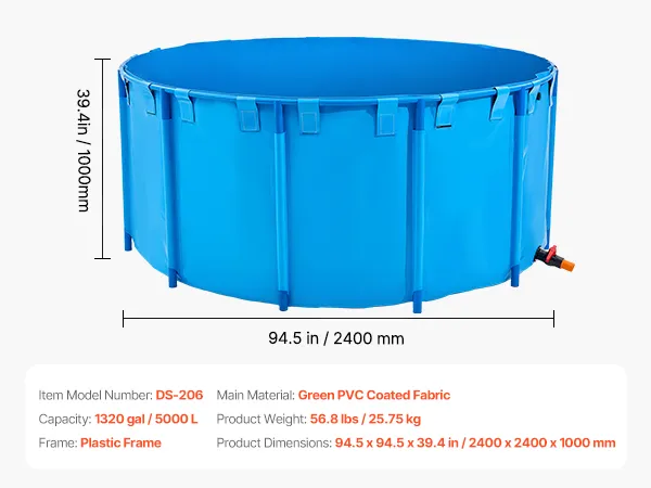 Large Capacity: This PVC fish pond measures 94.5 x 94.5 x 39.4 in (2400 x 2400 x 1000 mm) and holds up to 1320 gallons, providing ample space for aquatic life. It is ideal for indoor and outdoor aquaculture.