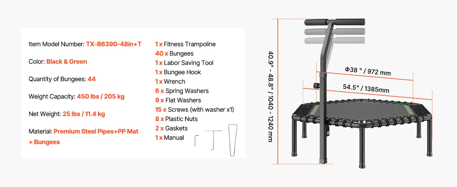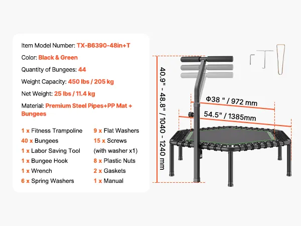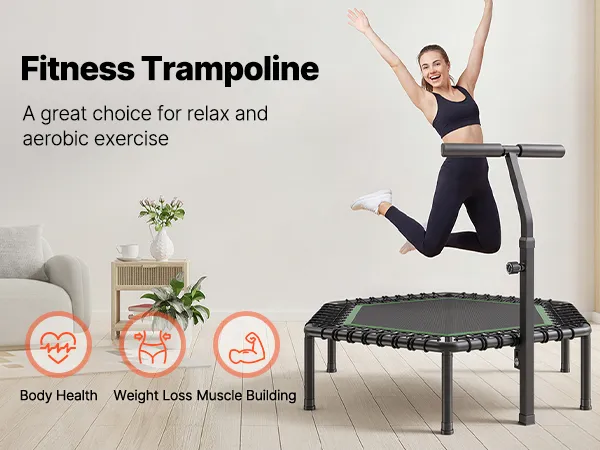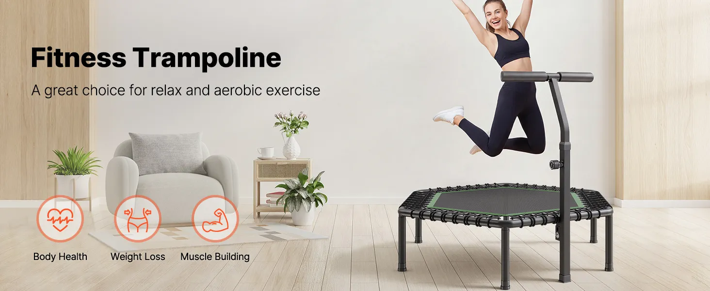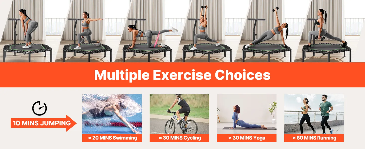 3-Level Adjustable Height: Achieve the ideal bounce height with the mini trampoline's 3-level adjustable handlebar, ranging from 37 to 49 inches. Adjust the height to match your comfort level and maximize your workout performance