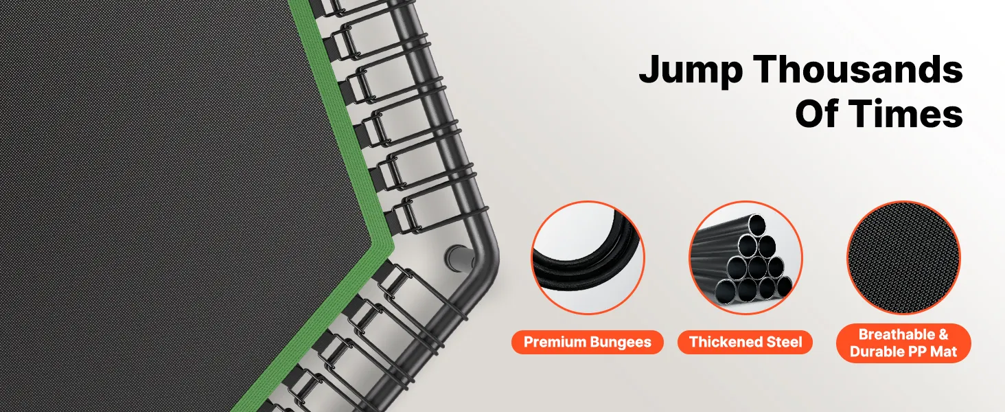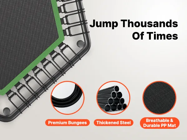 High-Strength Bungees: Enjoy a smooth and gentle bounce with our high-strength bungees, designed for sustained elasticity. They help reduce a wide range of vibrations, making it easier on your knees, joints, and back