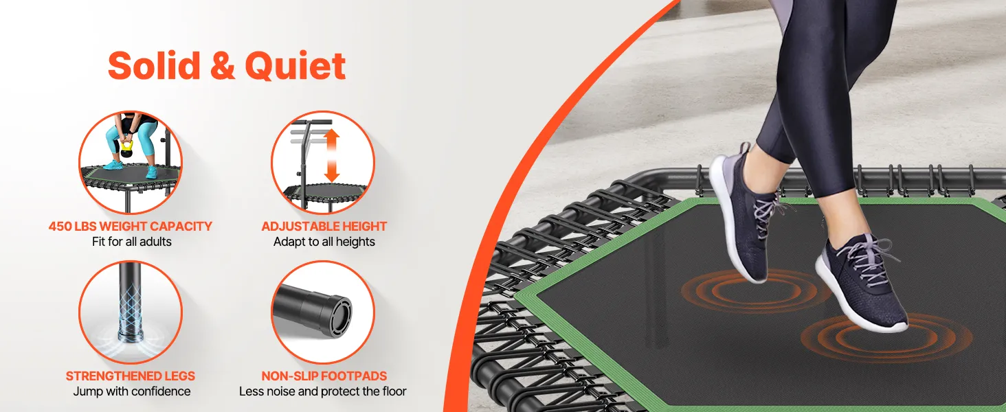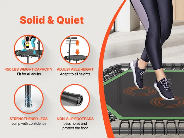 450 LBS Weight Capacity: Built with a thickened steel frame and reinforced legs, this fitness trampoline supports up to 450 lbs for a stable jumping experience. Non-slip footpads reduce noise, allowing quiet use without disturbing others