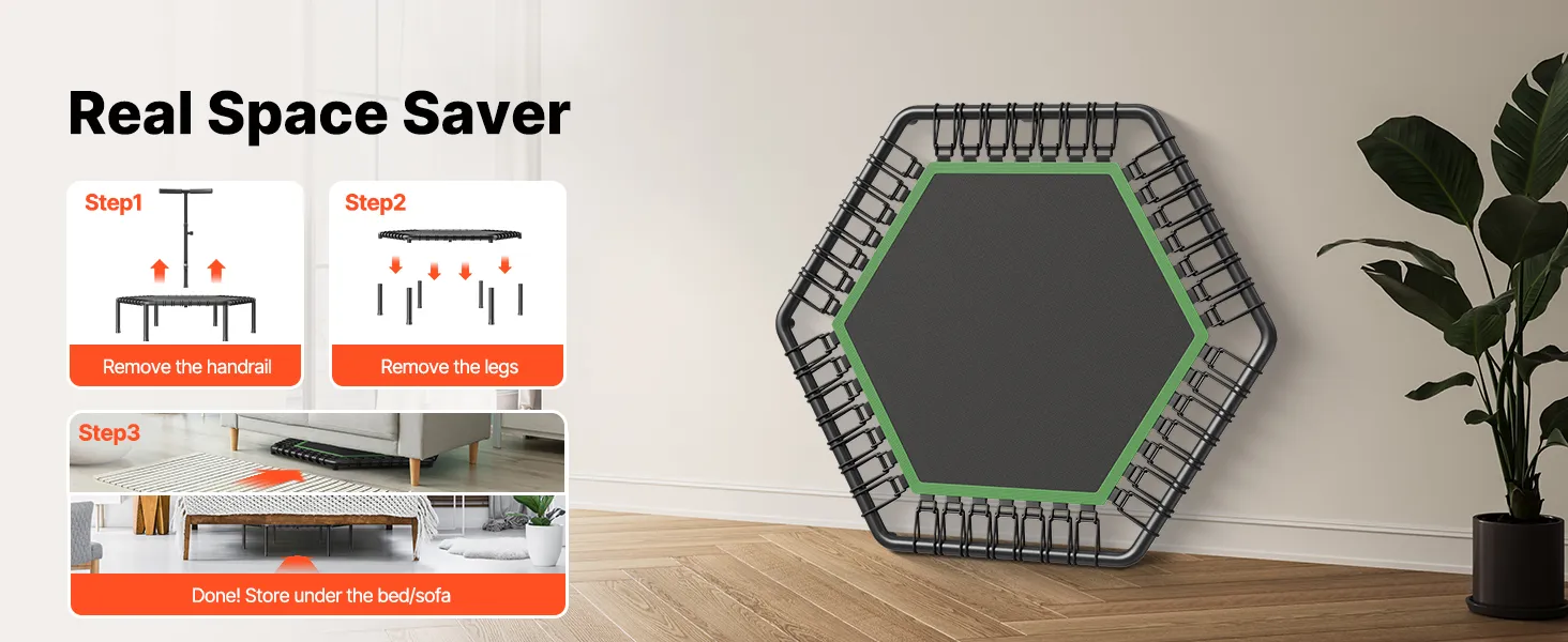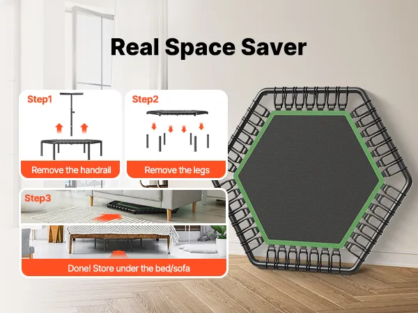 Store at Ease: Save space effortlessly with the legs’ detachable design. It reduces to 80% of its original size, making storage a breeze. Whether under the bed, sofa, in the corner, or even in the trunk of your car, this trampoline is easy to tuck away when not in use