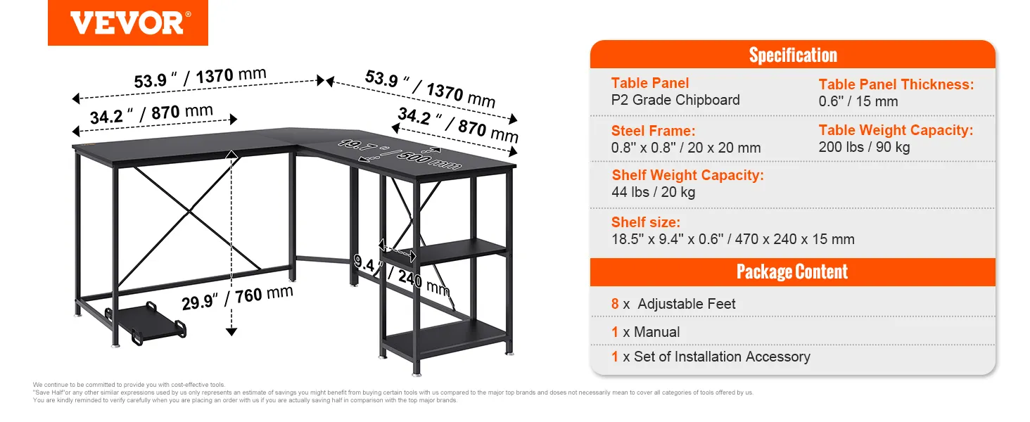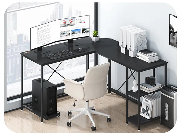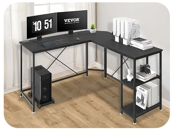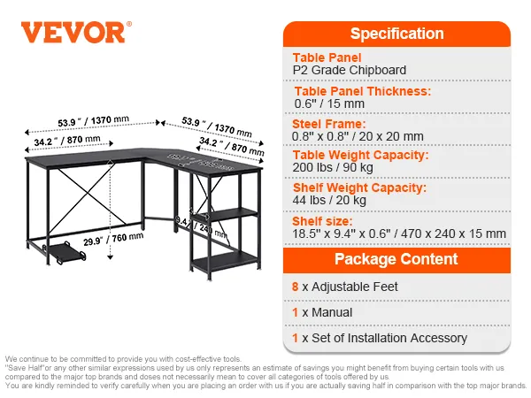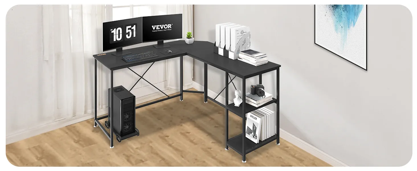 L Shaped Desk for Corner Space: With L-shaped design and main desktop size 54"x19.7", VEVOR L-shaped desk can maximize corner space and provide ample room for all your work essentials, keeping you organized and productive. Plus, its sleek and modern style adds a professional touch to any office. Upgrade your workspace today with our L-shaped office desk!