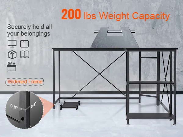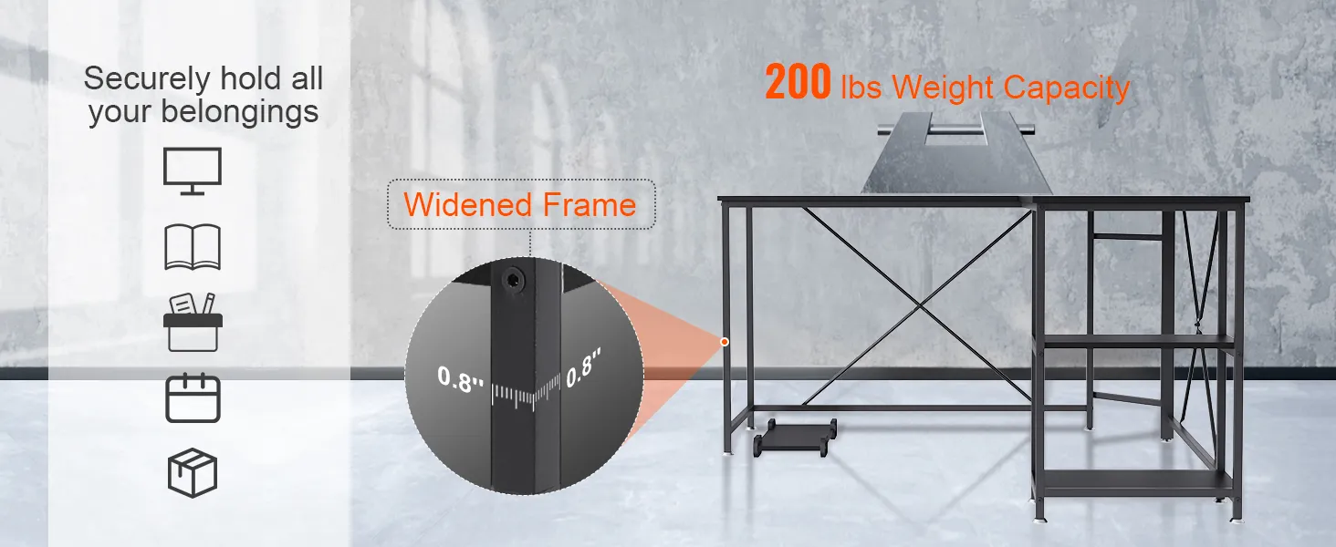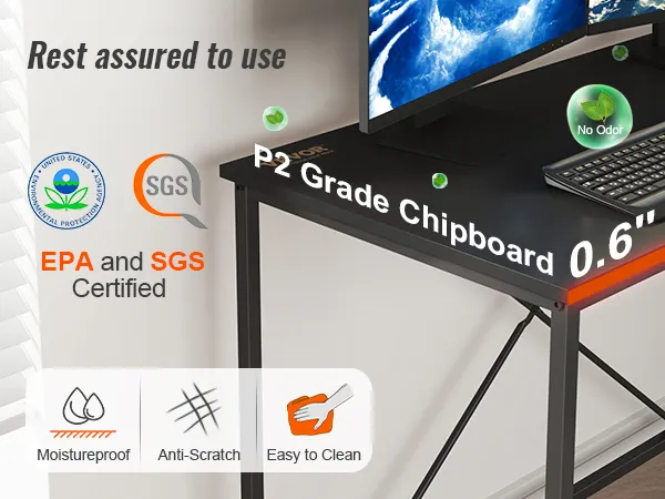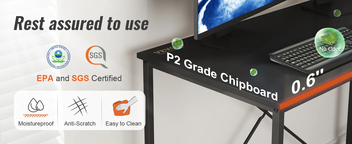 Crafted to Perfection: The tabletop of our desk is crafted from P2 chipboard that has been CARB certified, you and your family can rest assured to use. Plus, the tabletop is waterproof, scratch-resistant, and easy to clean, perfect for busy workspaces. And with a steel frame that's been powder-coated to resist rust and a weight capacity of up to 200lbs, you can trust this desk to hold all of your work supplies with ease.