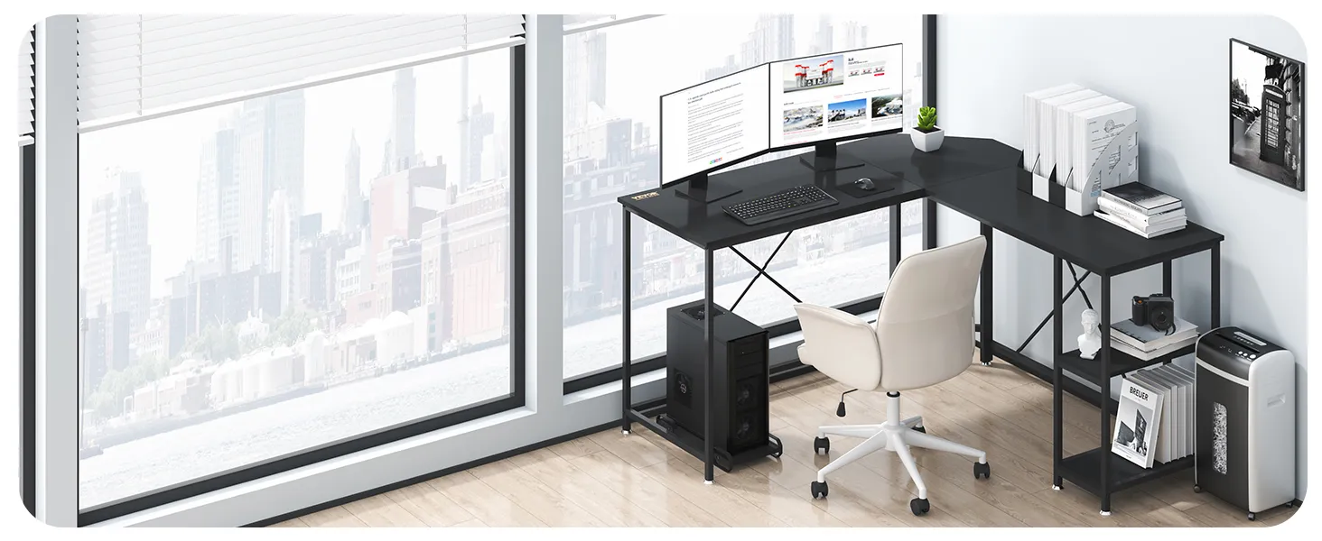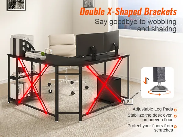 Dual-Stable: Our L-Shaped office desk is equipped with double X-shaped brackets that provide rock-solid support for the tabletop, eliminating any wobbling or shaking. Plus, adjustable foot pads ensure your desk stays safe and stable even on uneven floors, without scratching the floor, so you can focus on what really matters.
