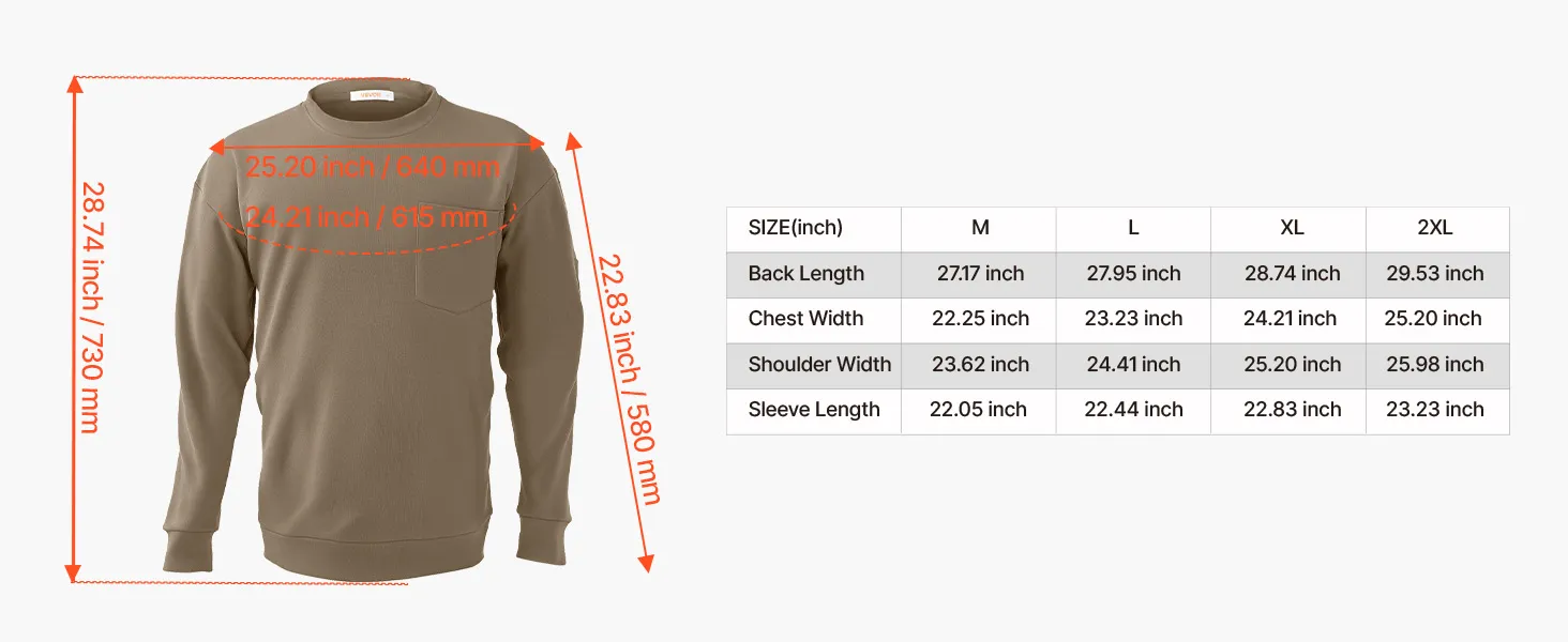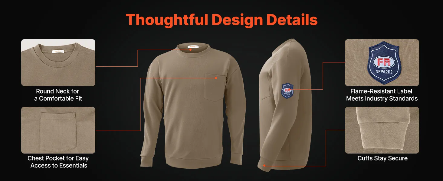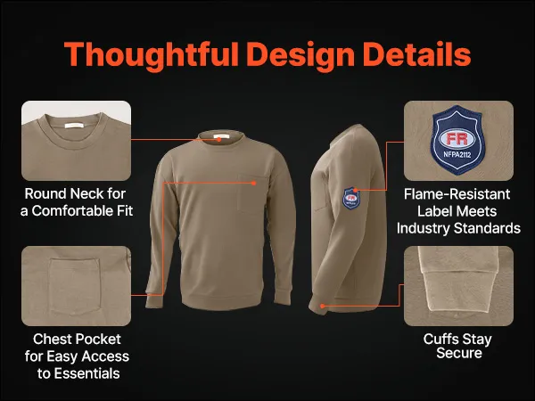 The classic crew neck offers a non-restrictive fit around the neck. A chest pocket provides quick access to ID badges, pens, or small tools. Flame-resistant labeling ensures industry compliance, while the clean cuff design avoids sagging.