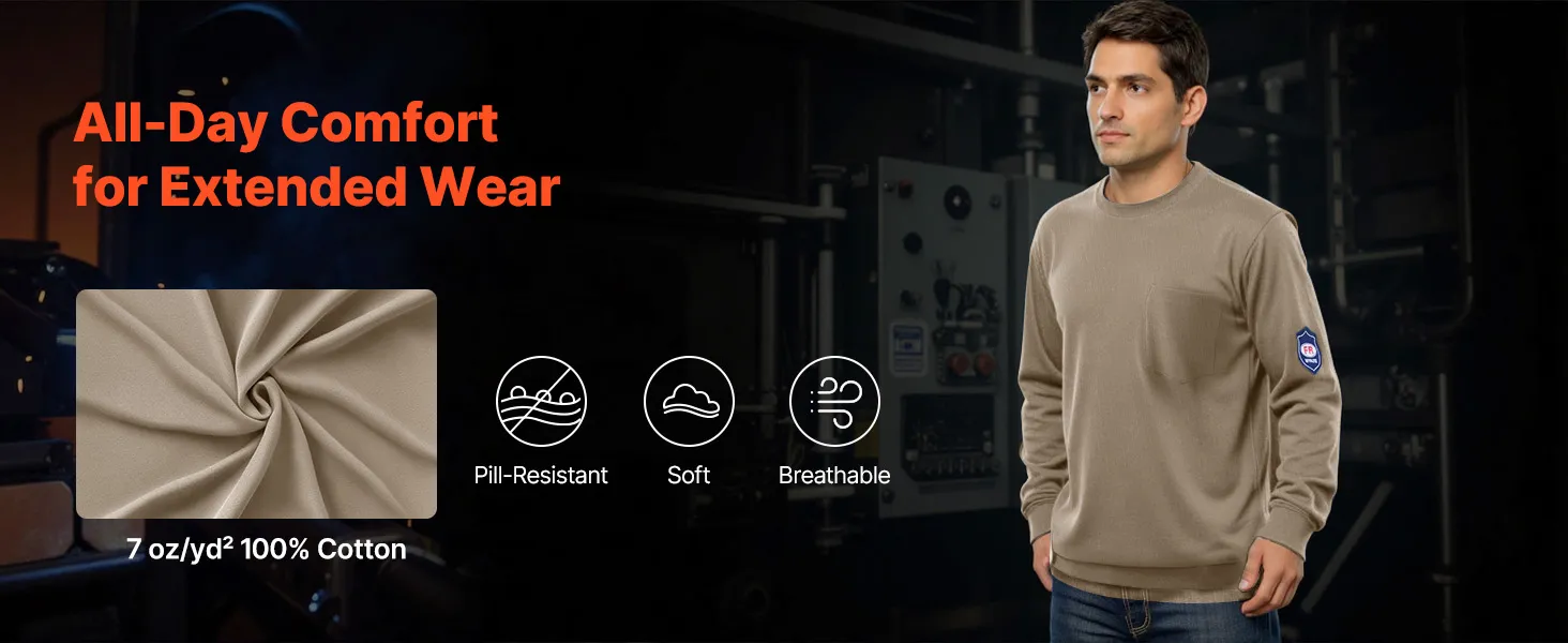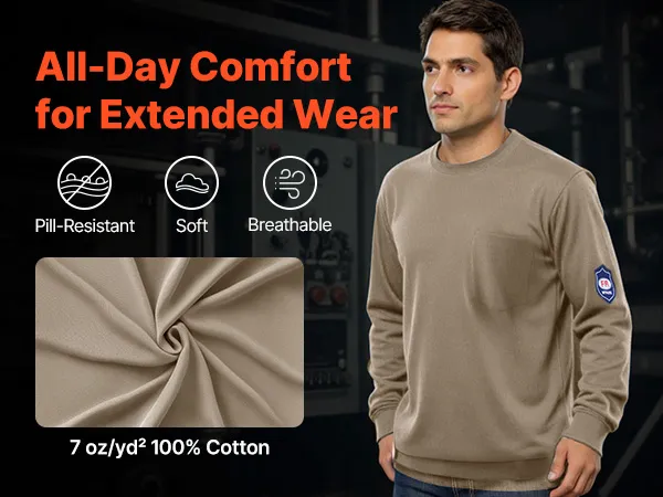 Comfortable & Breathable: Crafted from 100% flame-resistant cotton, this FR long sleeve t shirt is soft, breathable, and damp-wicking—ideal for staying cool and comfortable during demanding shifts