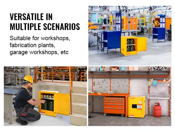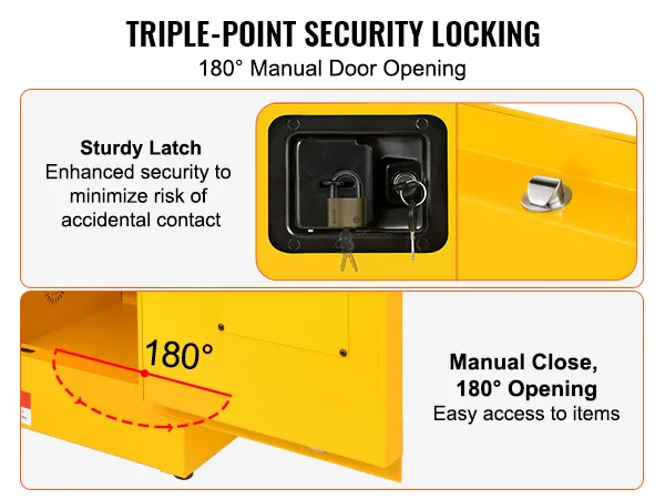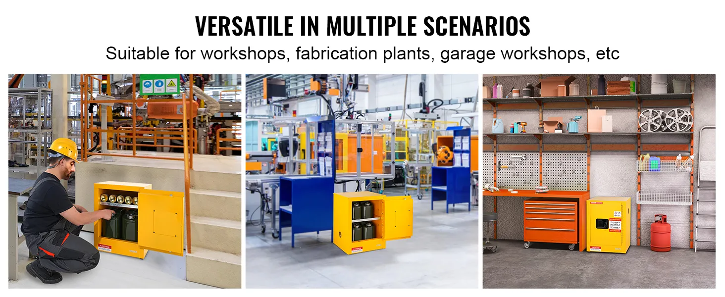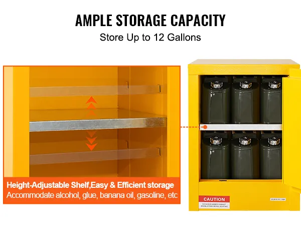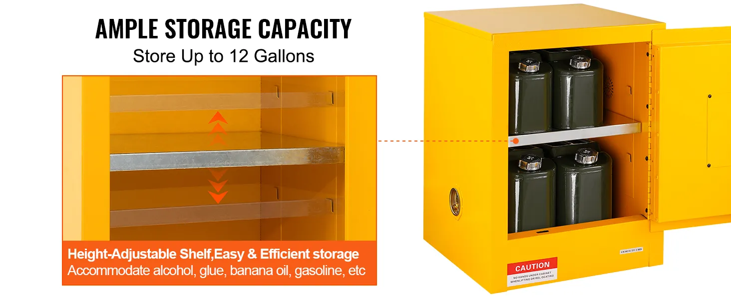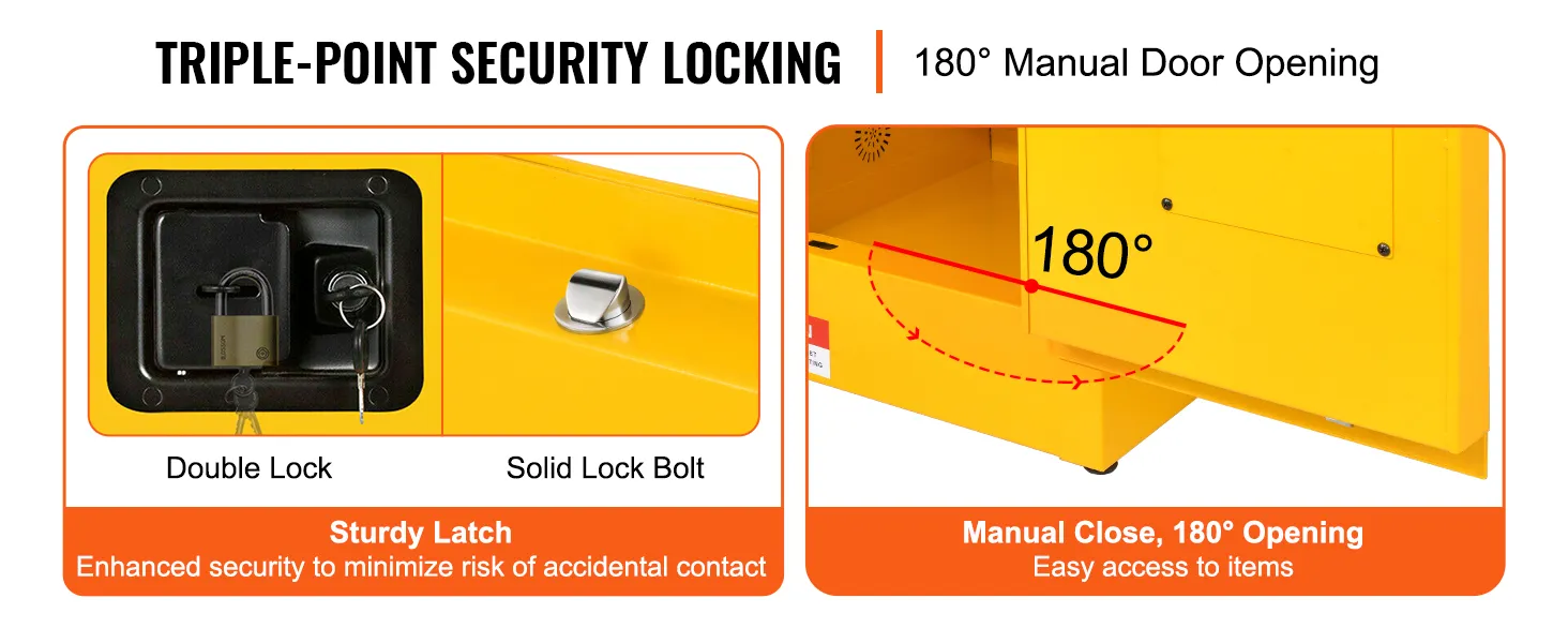 This flammable cabinet has an effortless setup and is user-friendly. It comes ready to use out of the box with minimal assembly required. The adjustable shelf can be set to the desired height without any tools. The secure locking mechanism is also simple to operate, ensuring quick and hassle-free access. This user-friendly design makes it suitable for a wide range of users, from professionals in industrial settings to people at home. Simple setup and use add to the overall convenience and value of VEVOR flammable cabinets.