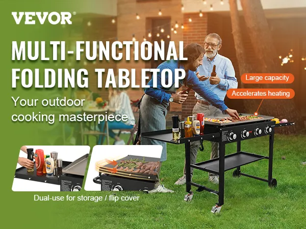This commercial flat top grill can be used as a flip cover or for storage. It accelerates heating during use, allowing for quick and delicious cooking. Whether it's camping, picnicking, or outdoor gatherings, it will enhance your outdoor cooking experience.