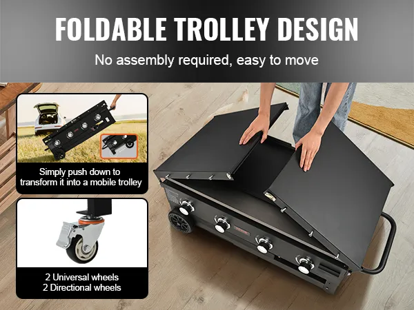 Convenient Mobility: With built-in wheels, our commercial flat top grill can be easily moved in the yard or outdoors. Unlike other folding grills, it can be dragged in the folded state, making it incredibly convenient when you're on the go. Just take it out of the trunk, and you're ready to move.