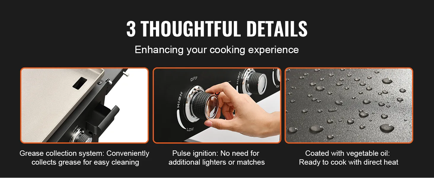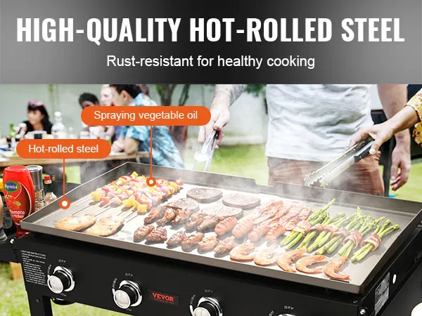 Durable Material: The propane griddle flat top grill is made of hot-rolled steel, ensuring its durability. It comes with a layer of vegetable oil coating to prevent rust and ensure healthier and safer cooking. The burners are made of stainless steel, capable of withstanding high temperatures without deformation.