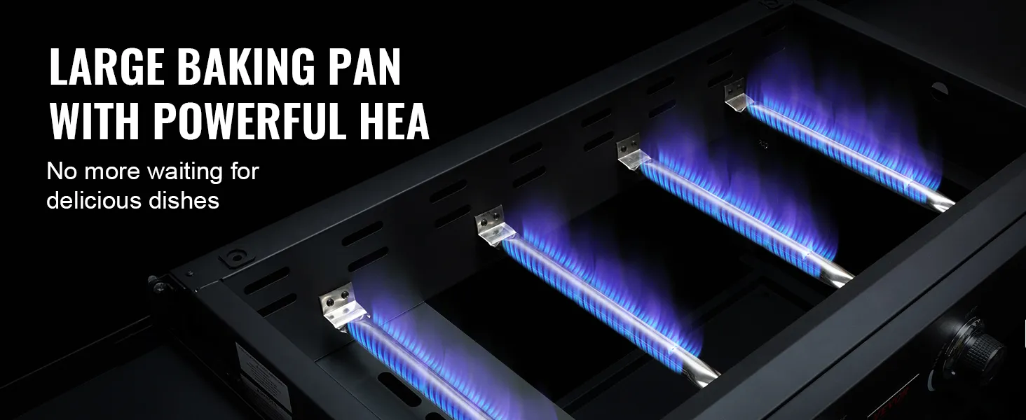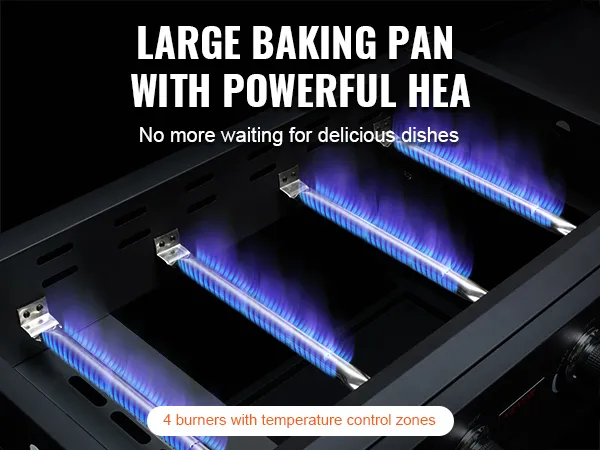 This 36" baking pan can satisfy a large gathering of food enthusiasts. With the ability to cook multiple dishes at once, it caters to big appetites. It is equipped with 4 burners for individual temperature control, allowing different cooking zones and a diverse culinary experience.